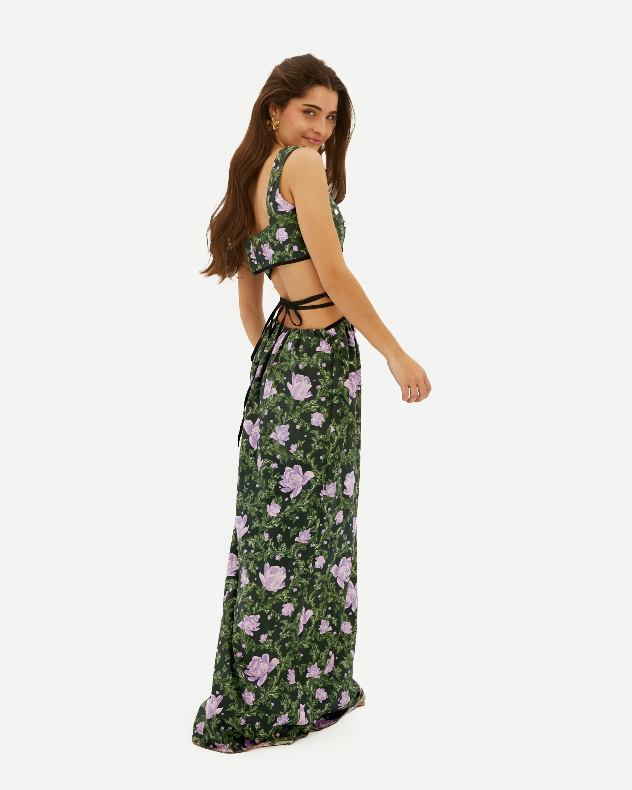 Vestido maxi verde con estampado floral en rosa y detalles negros. Escote cuadrado y abertura en la barriga.