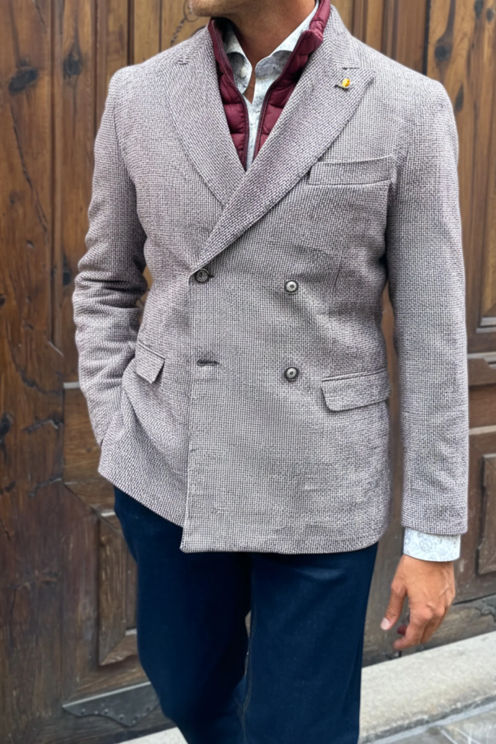 La Americana cruzada Ludovico, con textura cálida, tiene ese punto entre casual y elegante que buscas para dejar huella sin verte demasiado clásico como en el outfit de la imagen: con camisa, vaqueros y chaleco acolchado para un look equilibrado, masculino y moderno.