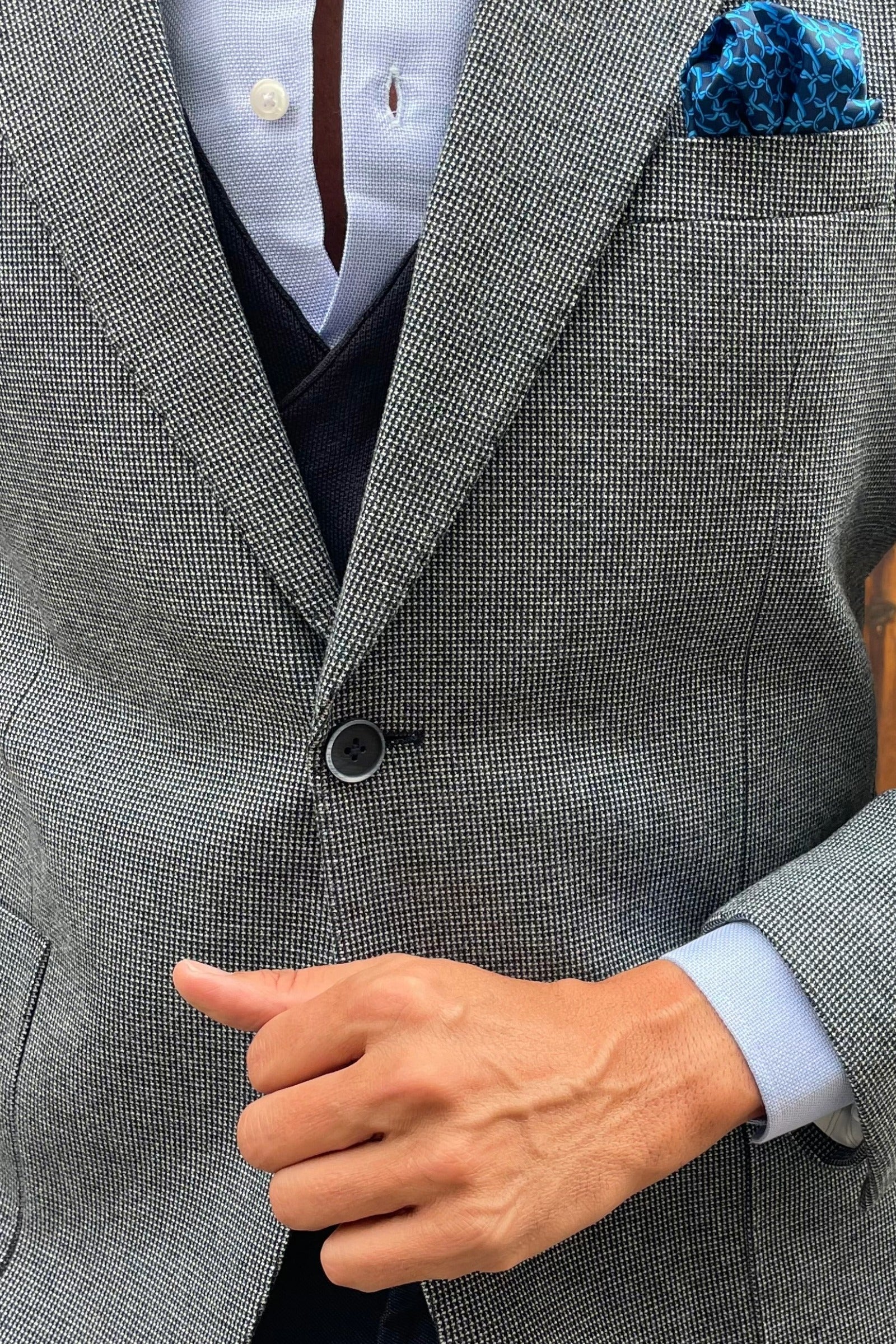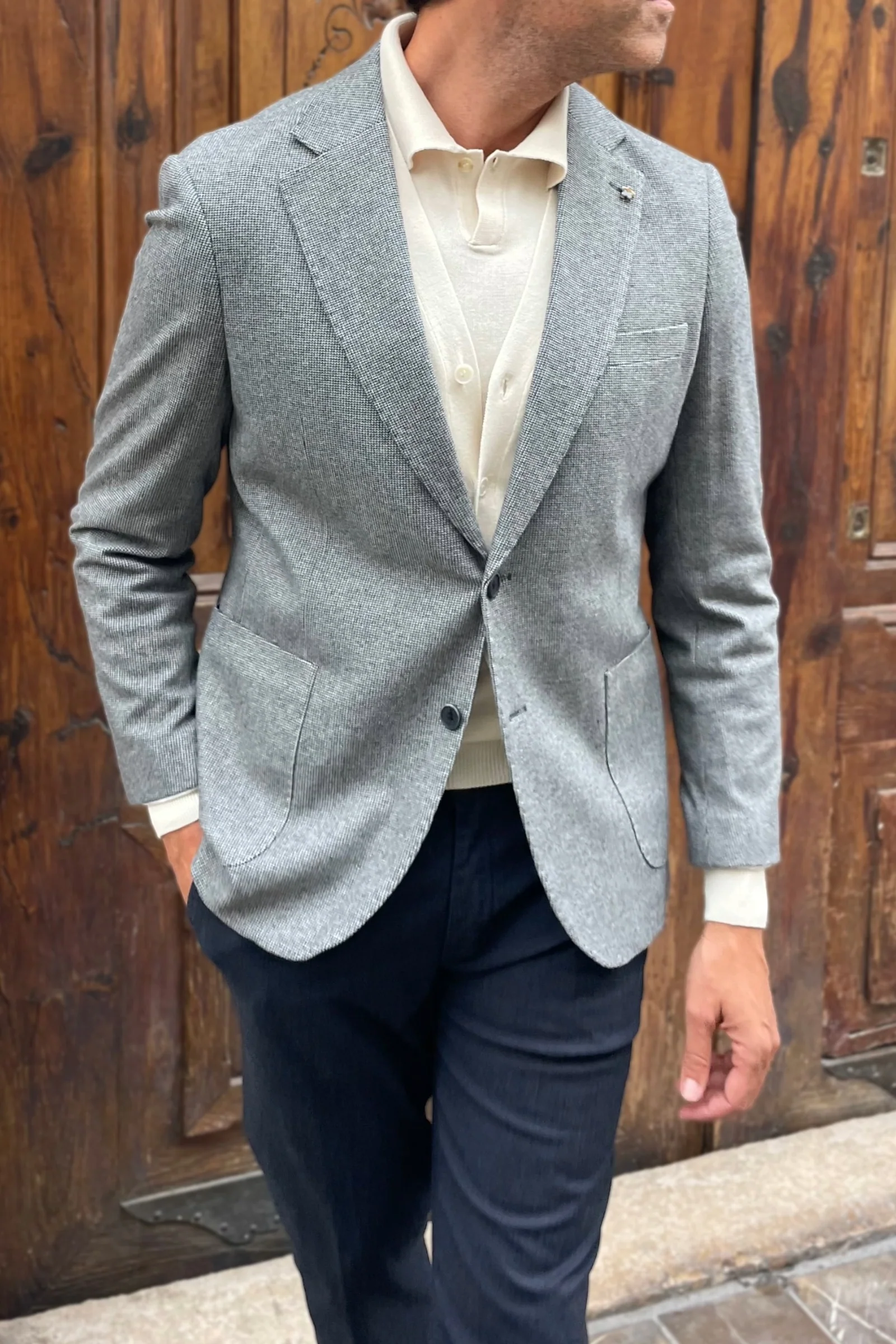 Tiene el corte limpio del buen vestir italiano, pero sin rigideces. Marca hombro, define cintura y cae justo donde debe. La textura otoñal del tejido acompaña con cuerpo y flexibilidad.