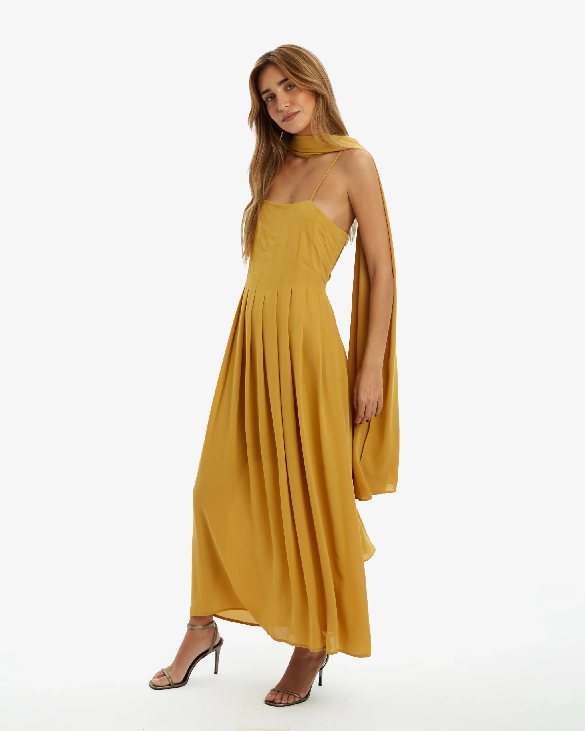 Vestido midi color mostaza con pliegues en pecho y falda. Incluye una capa a juego del mismo material multiposición.