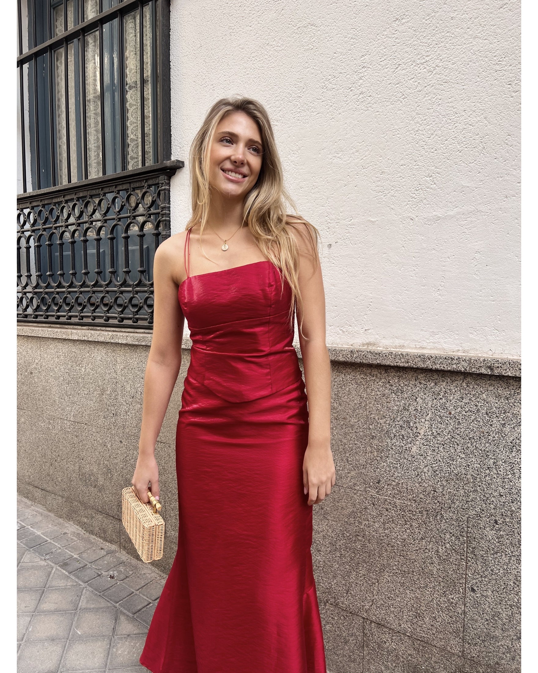 Conjunto vintage de top y falda. En color rojo/fresa. Top tipo corpiño con espalda cruzada. Falda gasa con efecto satinado.