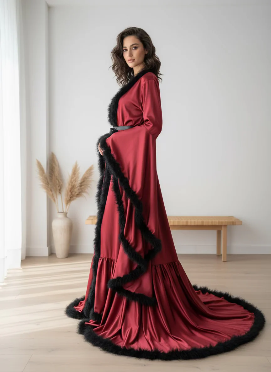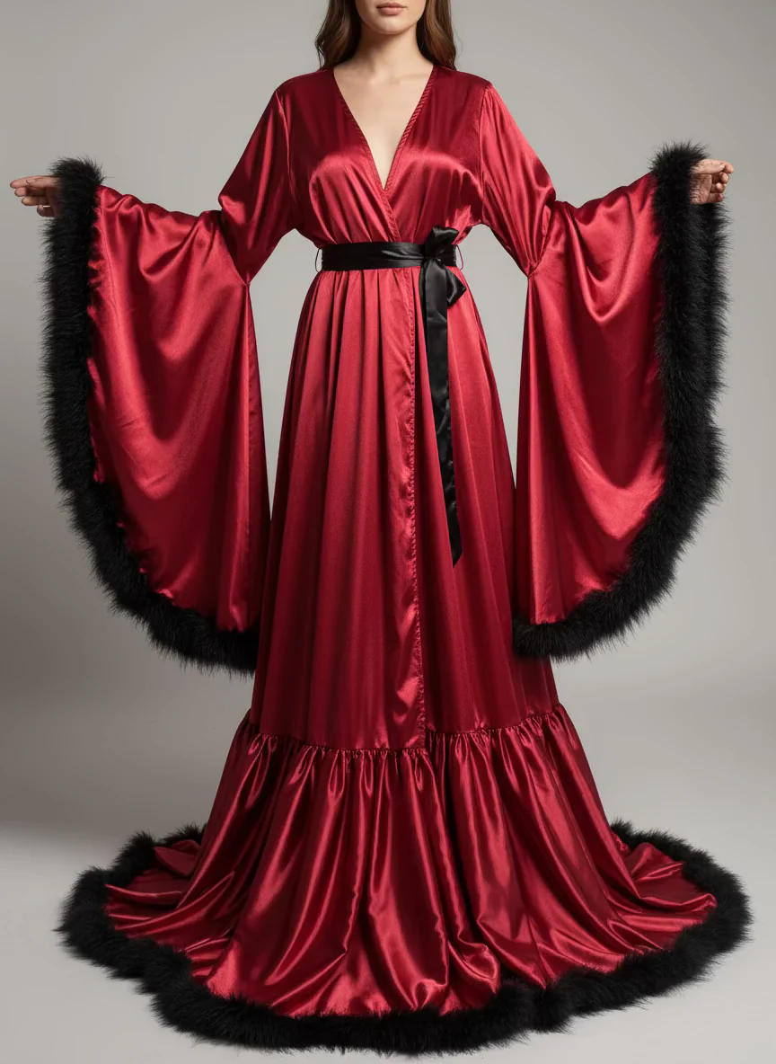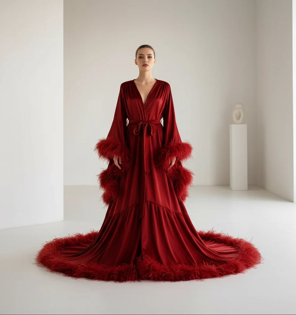 ⚠️ Importante: Esta bata no incluye lencería interior. El material es satinado (no seda natural) y las plumas son sintéticas decorativas.