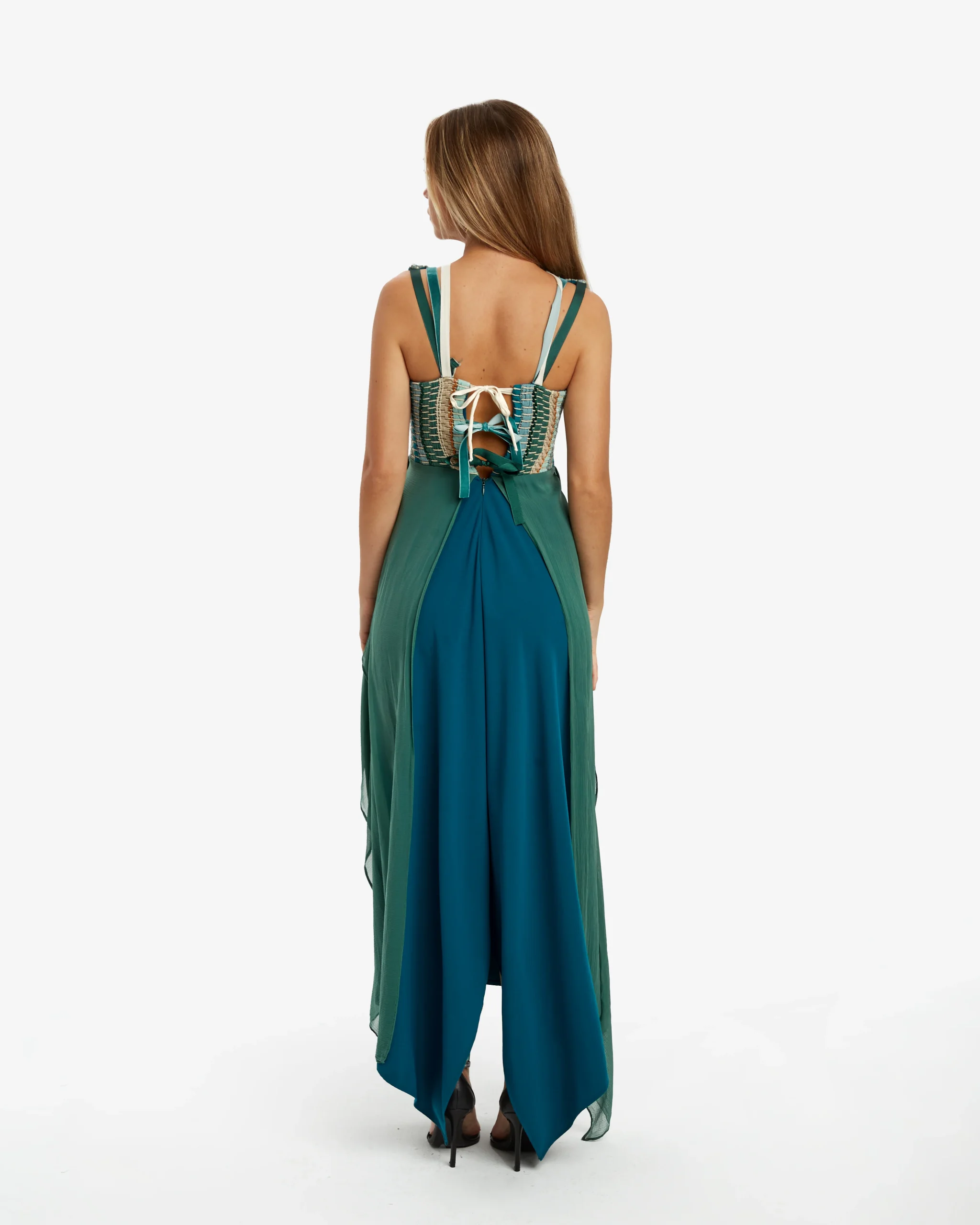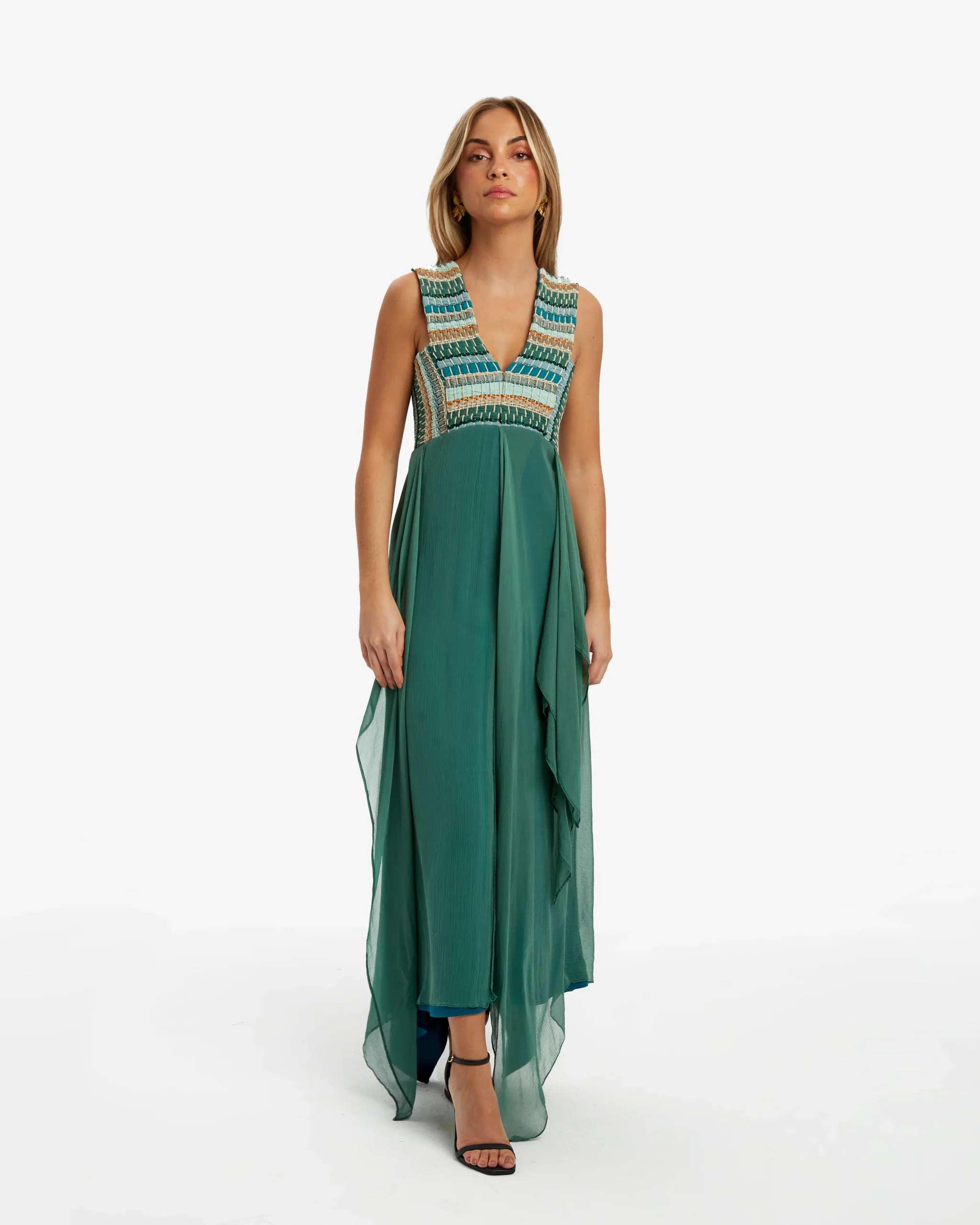 Vestido midi verde con cuerpo estampado sin mangas y espalda atada con lazadas. Bámbula de seda 100%