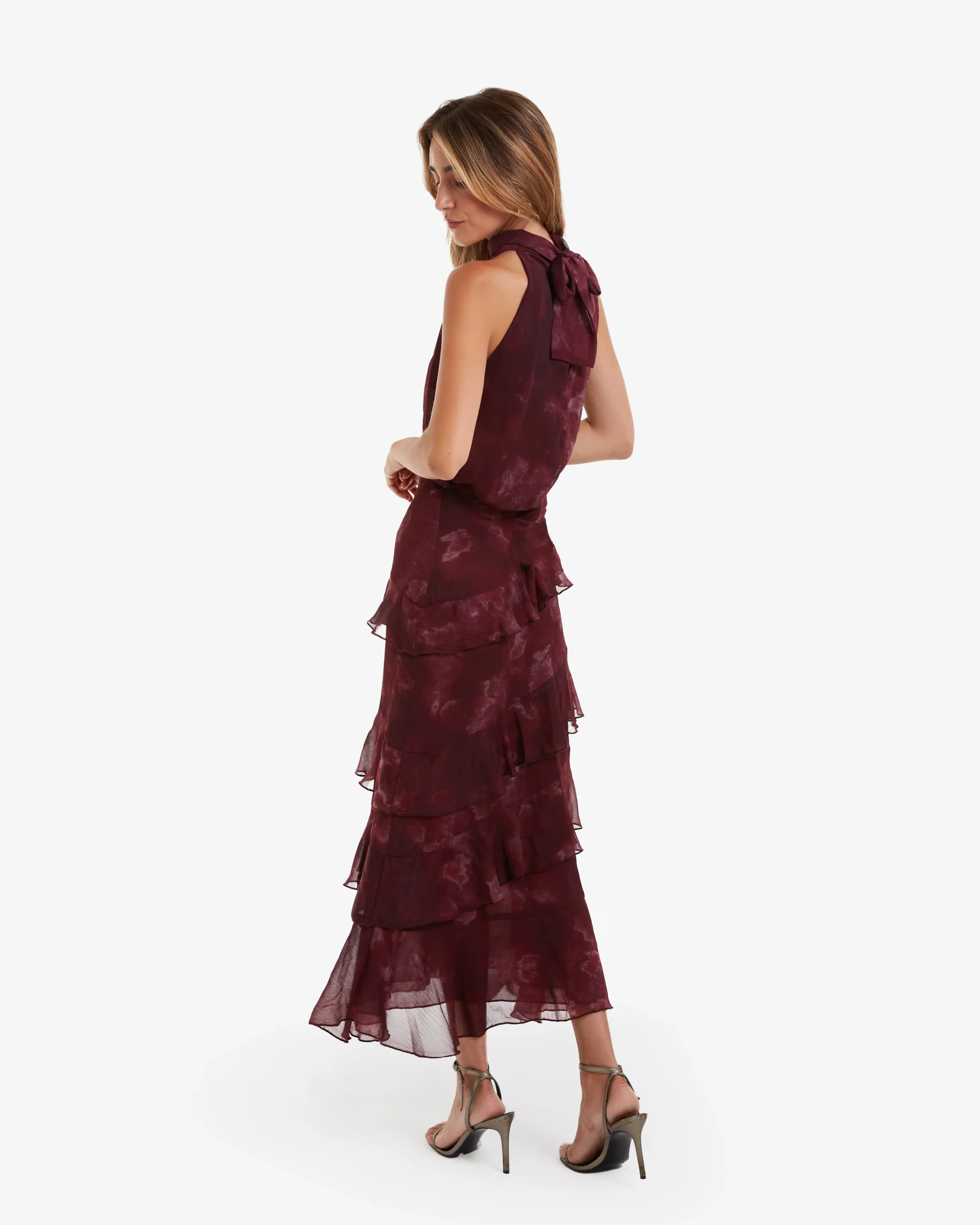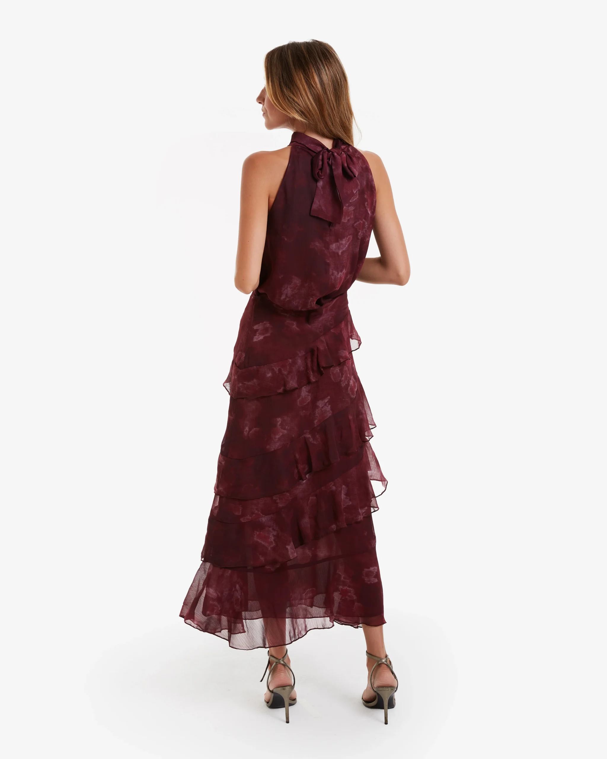 Conjunto dos piezas, con cuello halter y falda asimétrica de volantes en cascada. Color burdeos con estampado tie-dye en tonos claros.