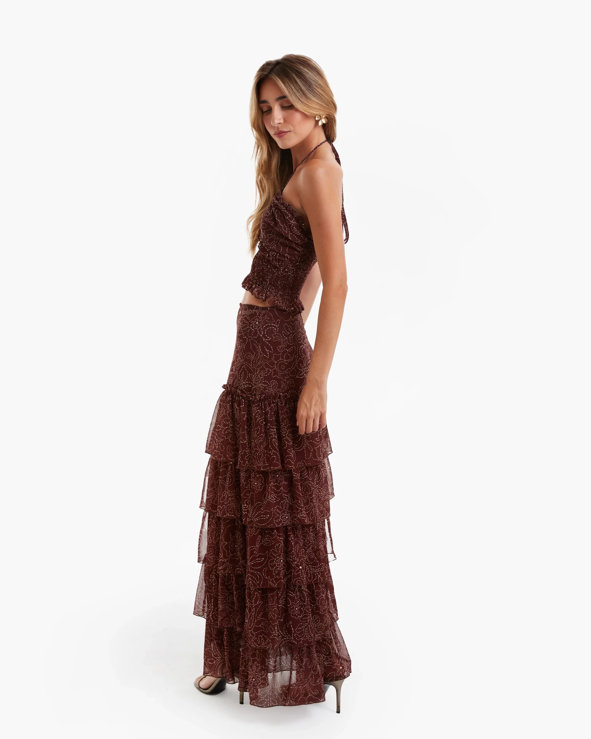 Conjunto de dos piezas , top fruncido con tirantes cruzados en la parte delantera y falda maxi con volantes. Color marrón con estampado floral en beige.