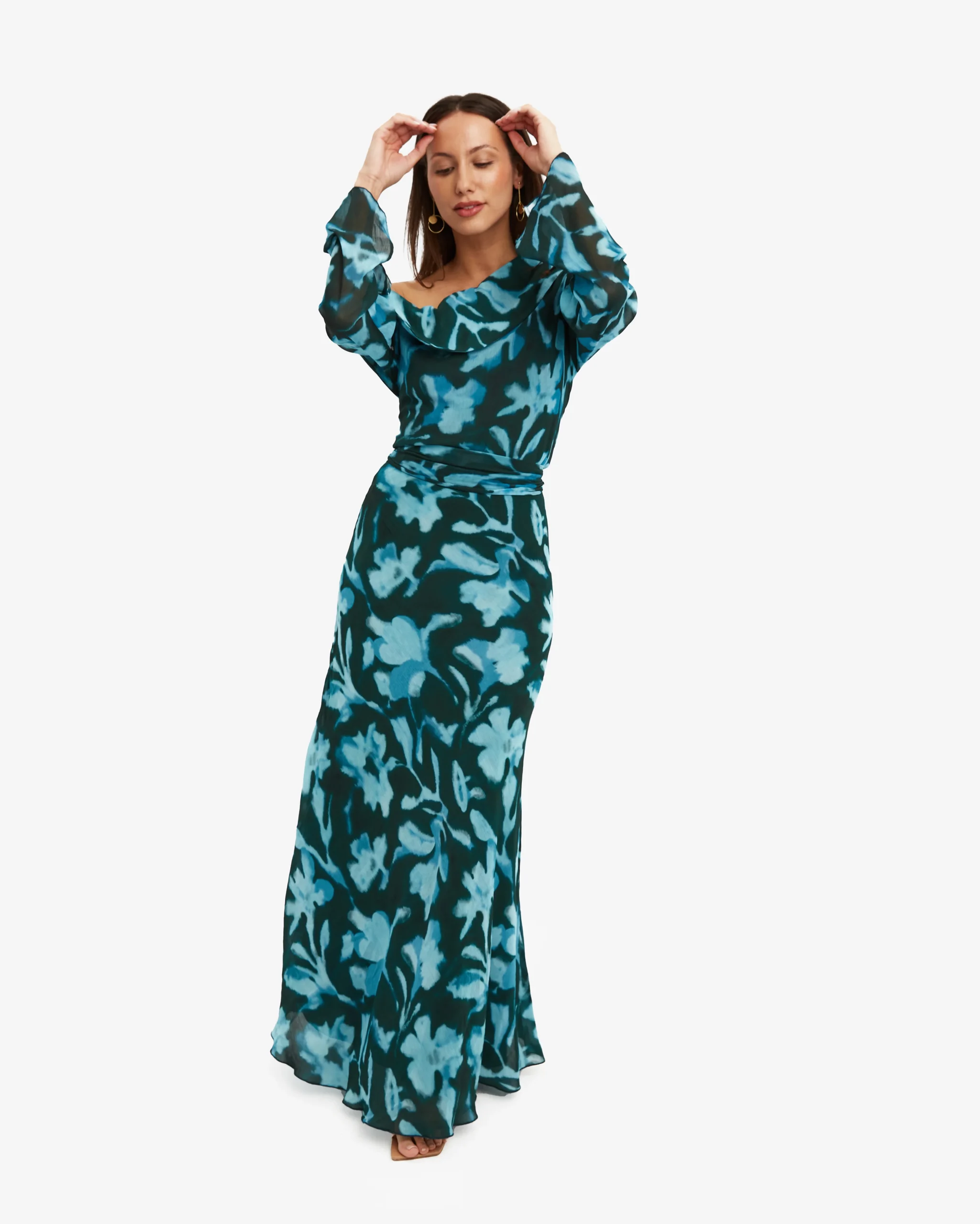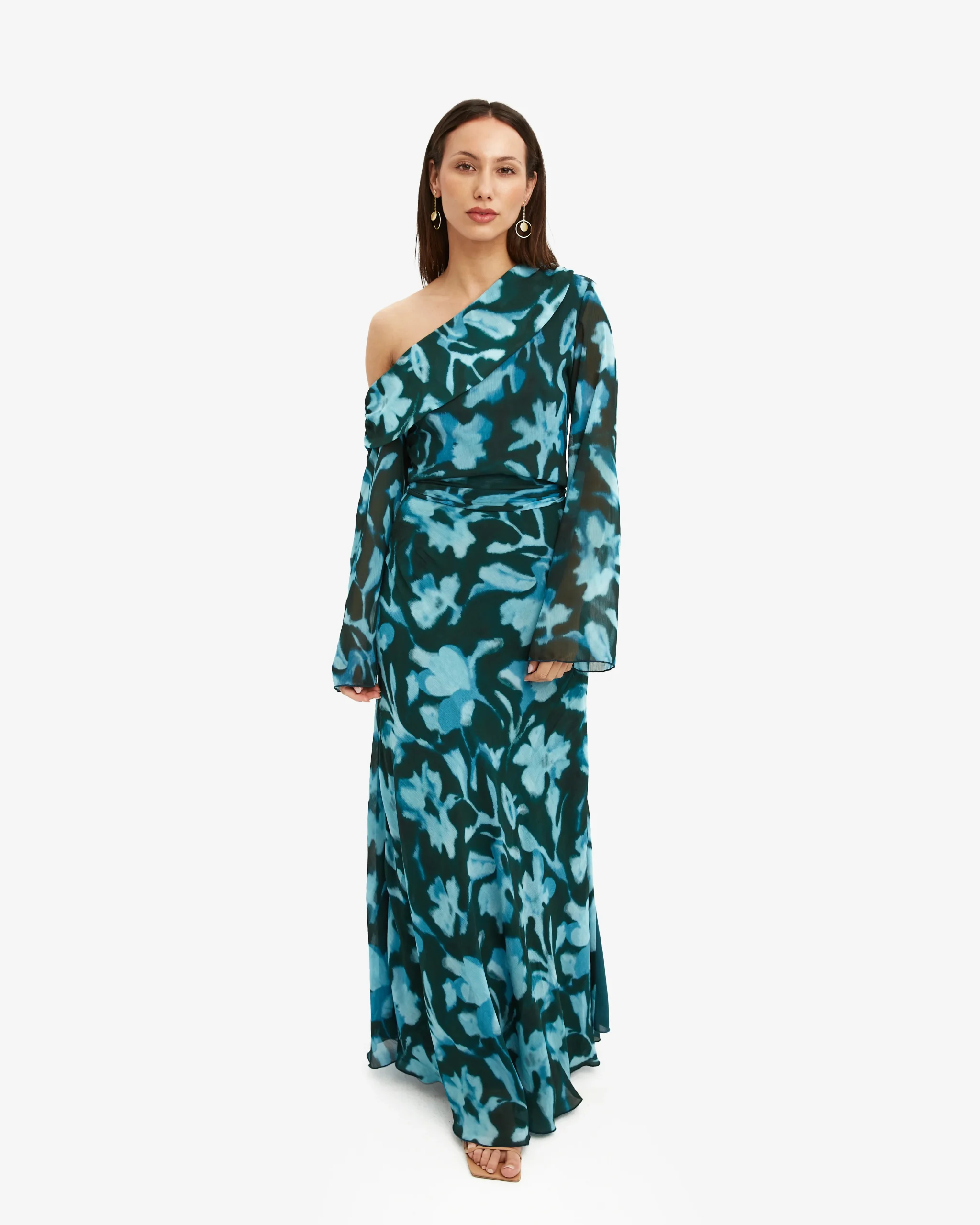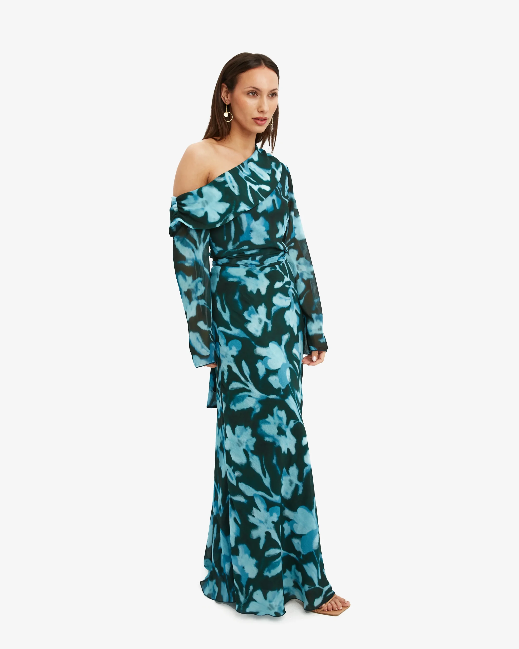 Conjunto de dos piezas estampado. Top asimétrico hombro descubierto y choker. Falda larga.