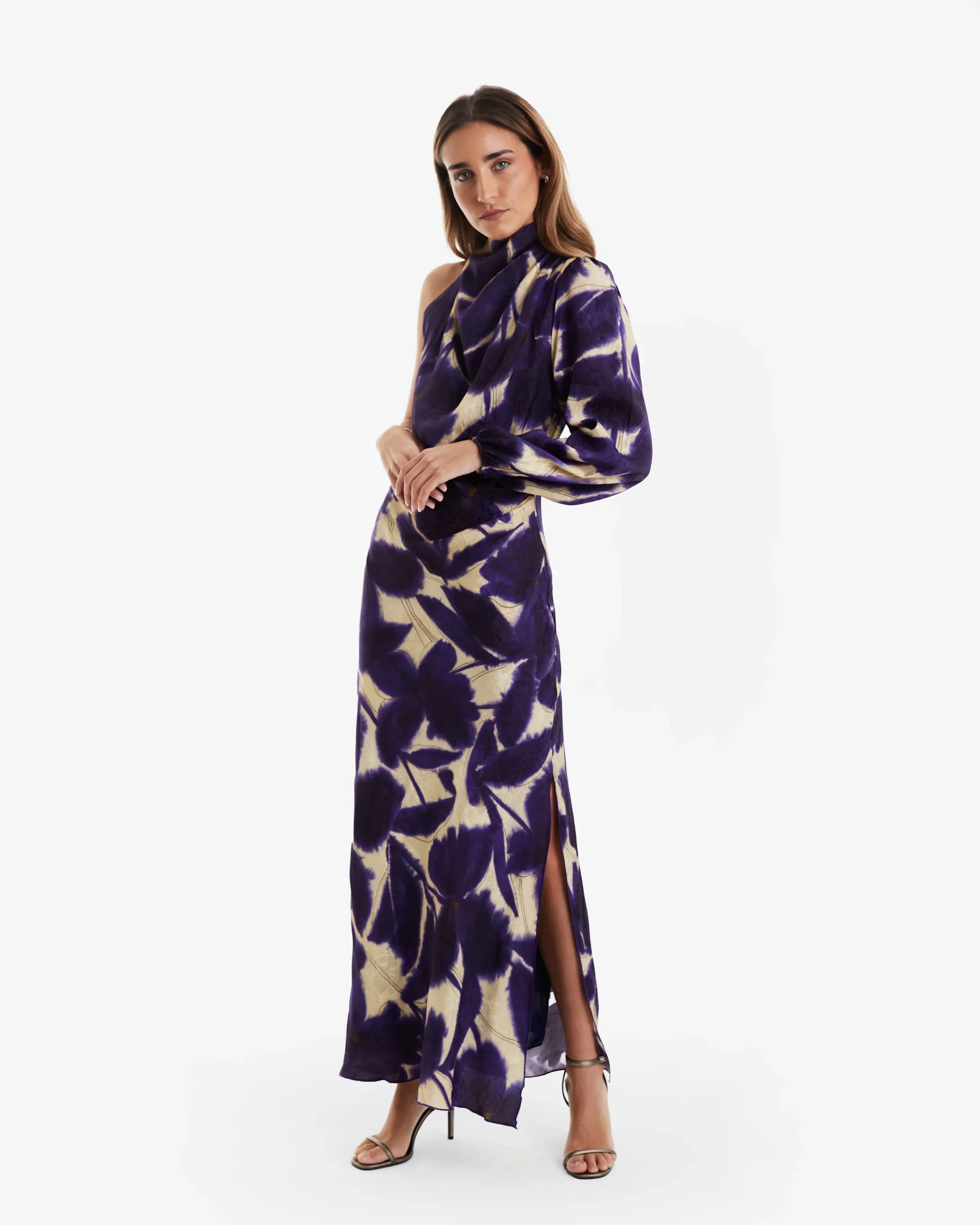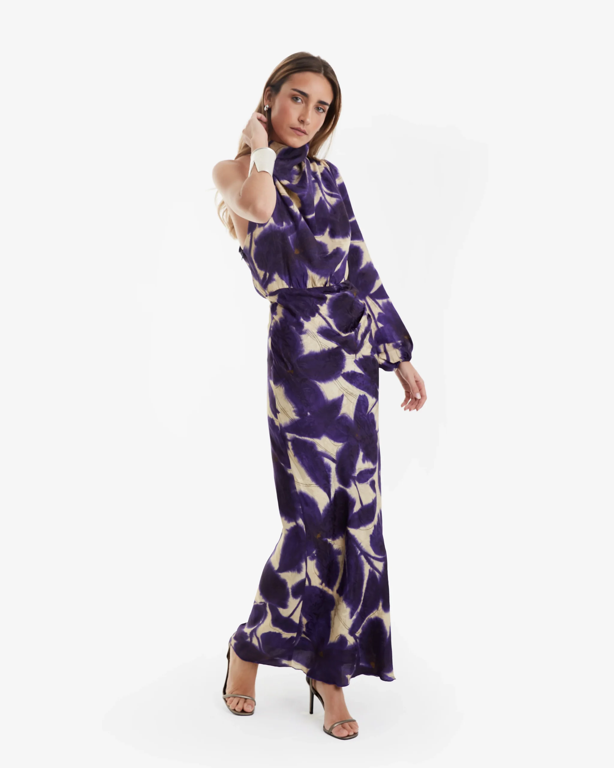 Vestido estampado floral morado de una manga larga con lazada al cuello.