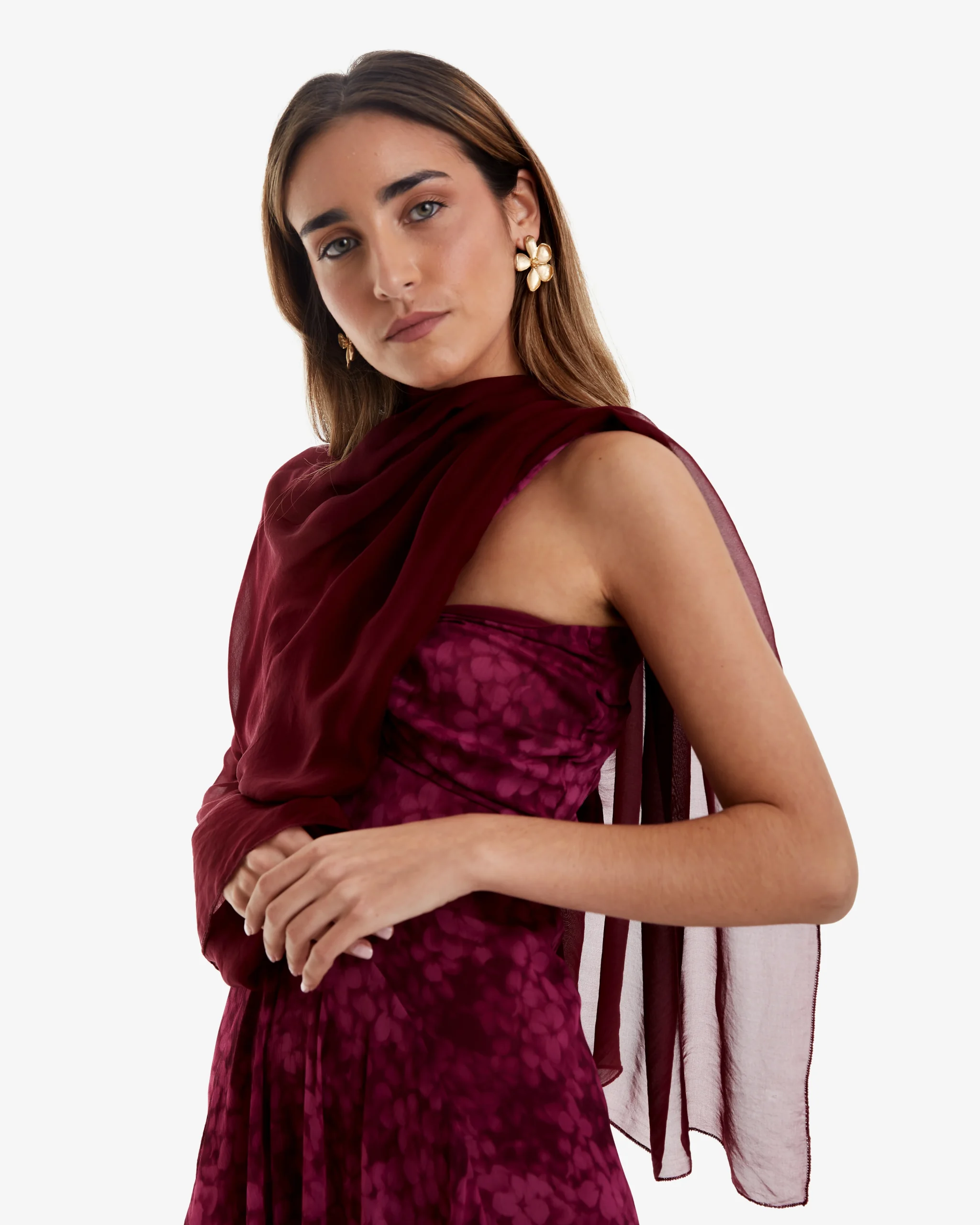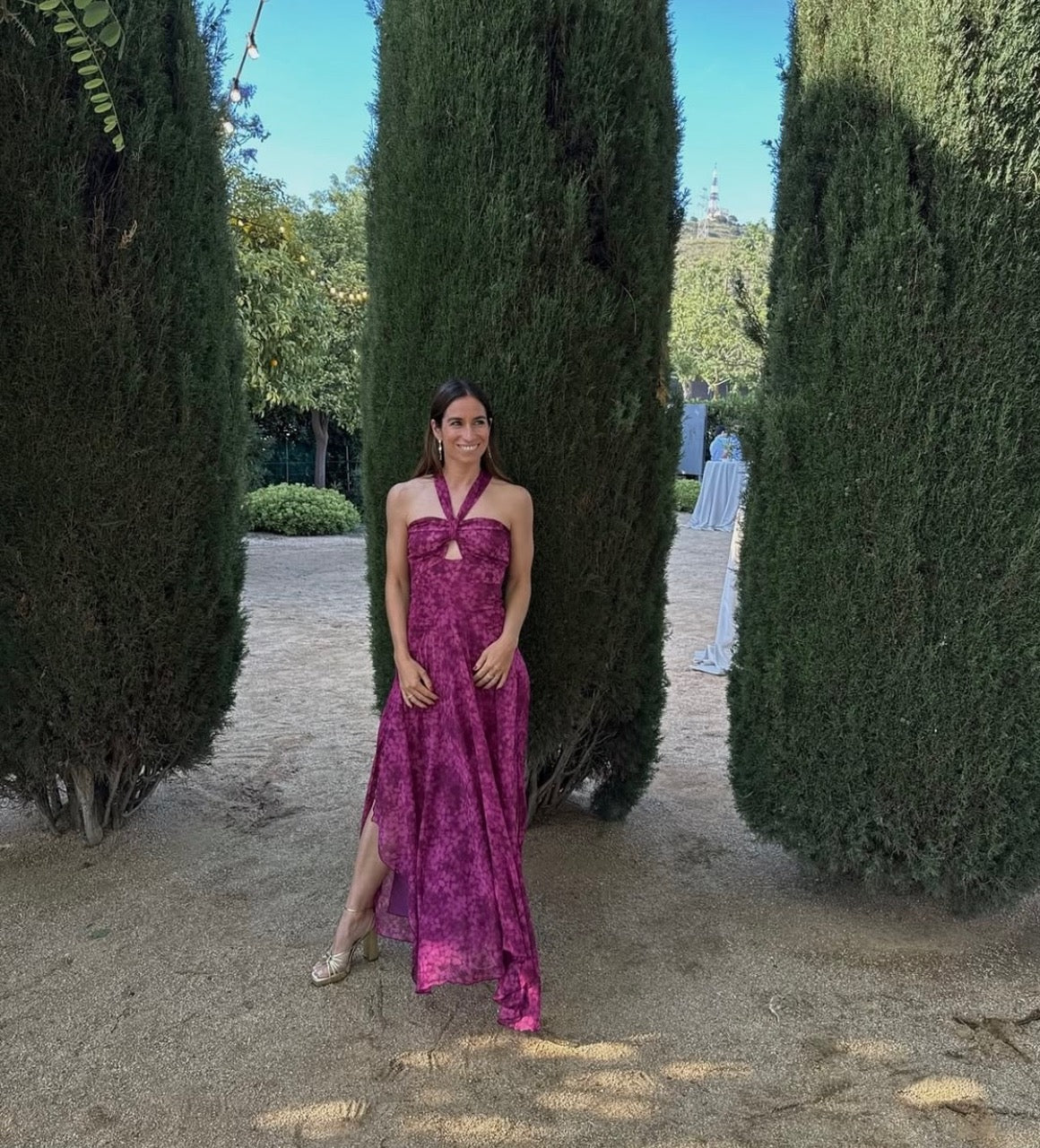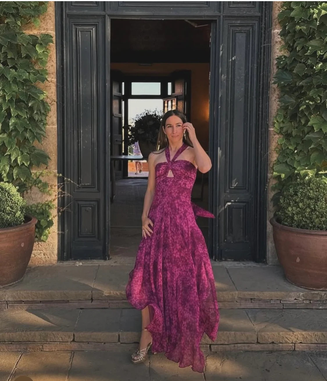 Vestido estampado floral rosa con dos tirantes hacia el cuello, cut out en la cintura y espalda abierta.