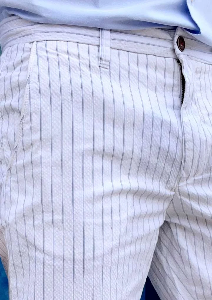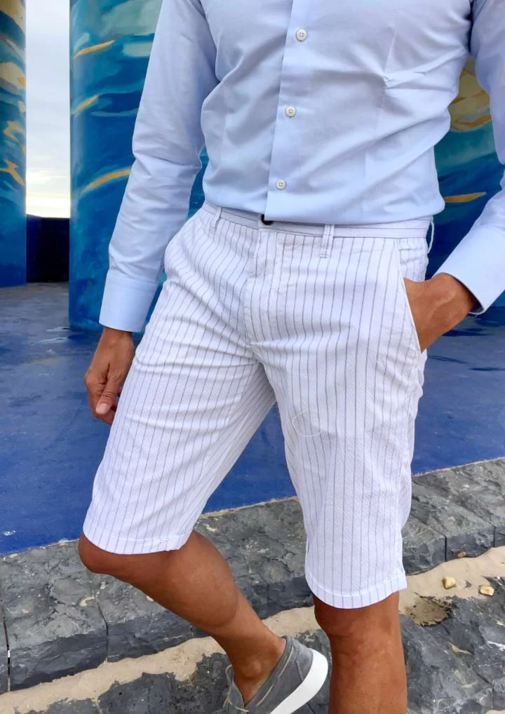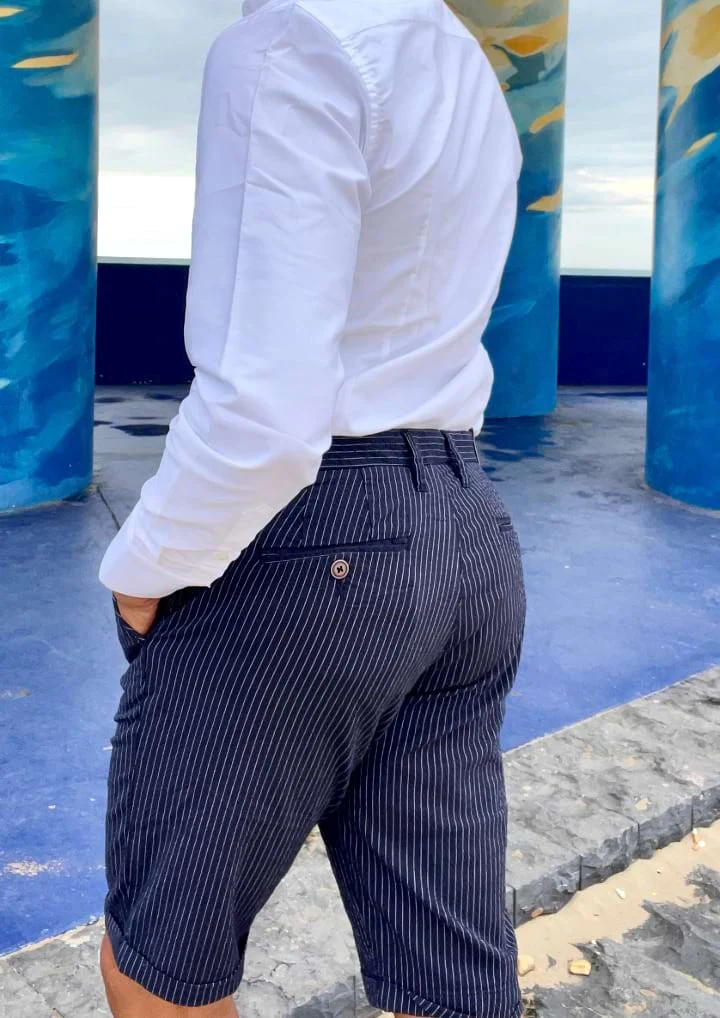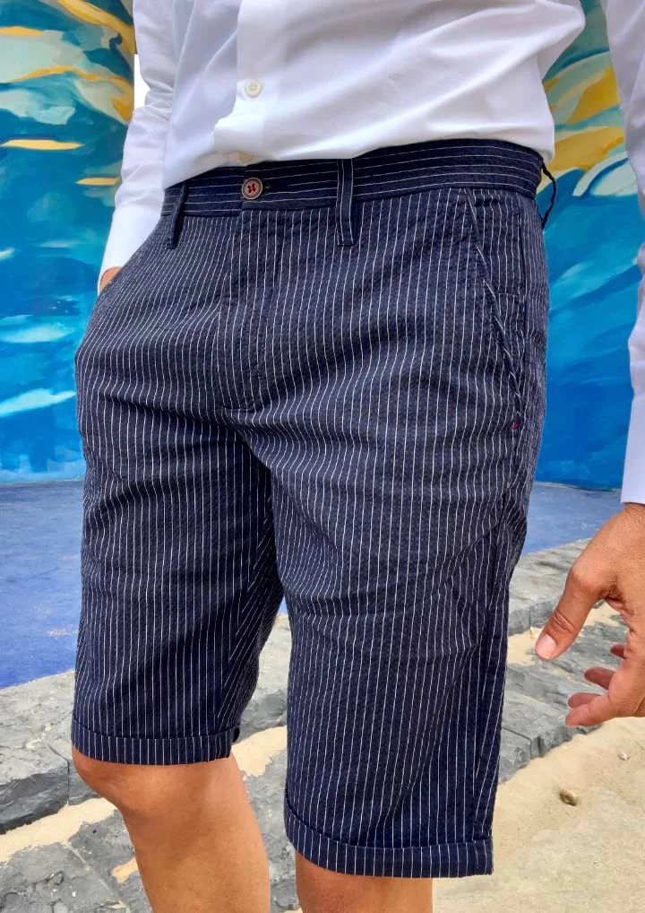 La Bermuda Righe, mantiene el fit impecable, ligeramente elástico de nuestros pantalones largos para que tus outfits sigan siendo de 10 en verano.