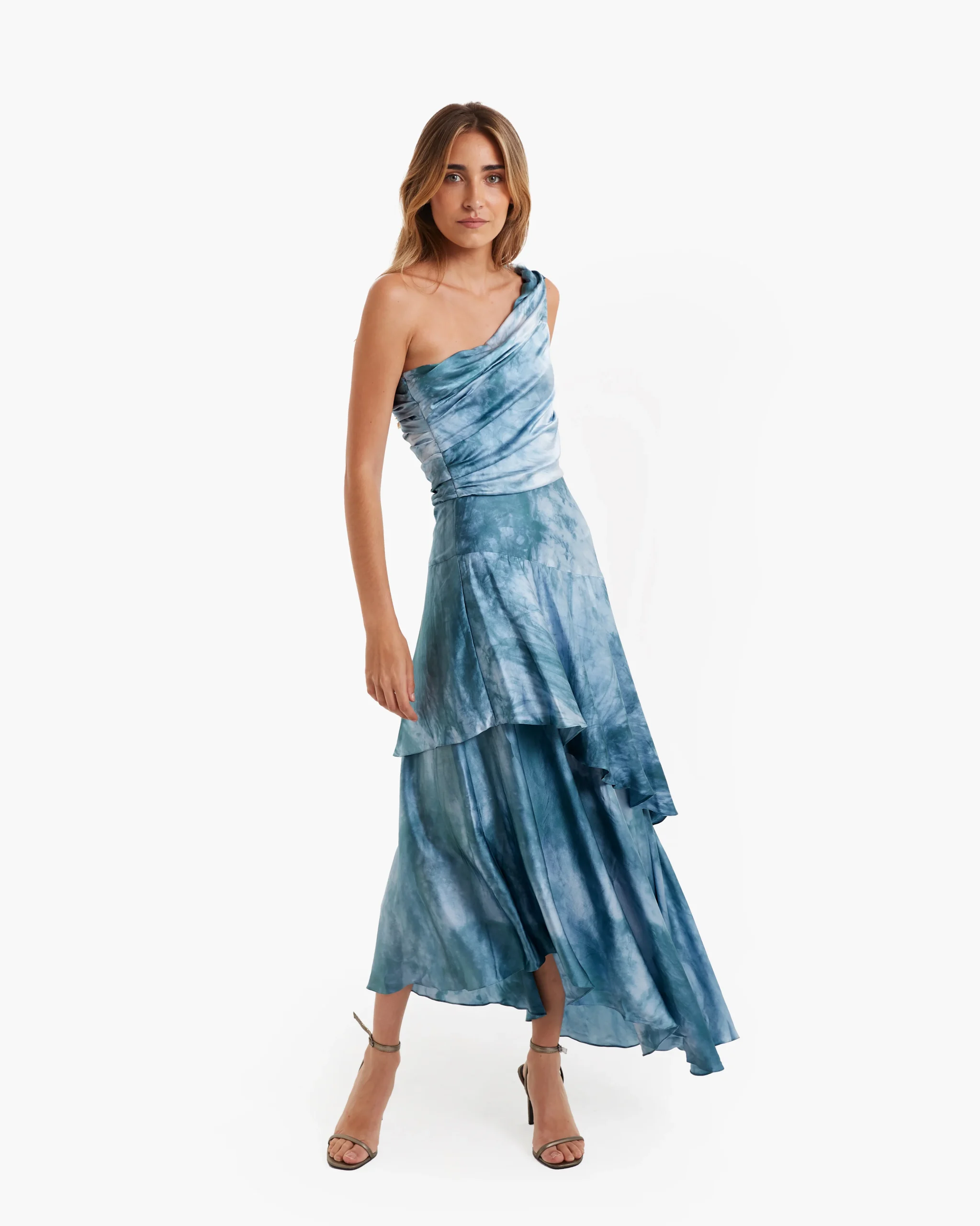 Teñido a mano con manchas en distintas tonalidades de azul, con escote asimétrico y volantes en la falda.