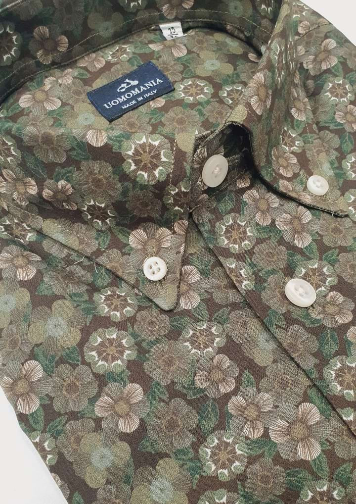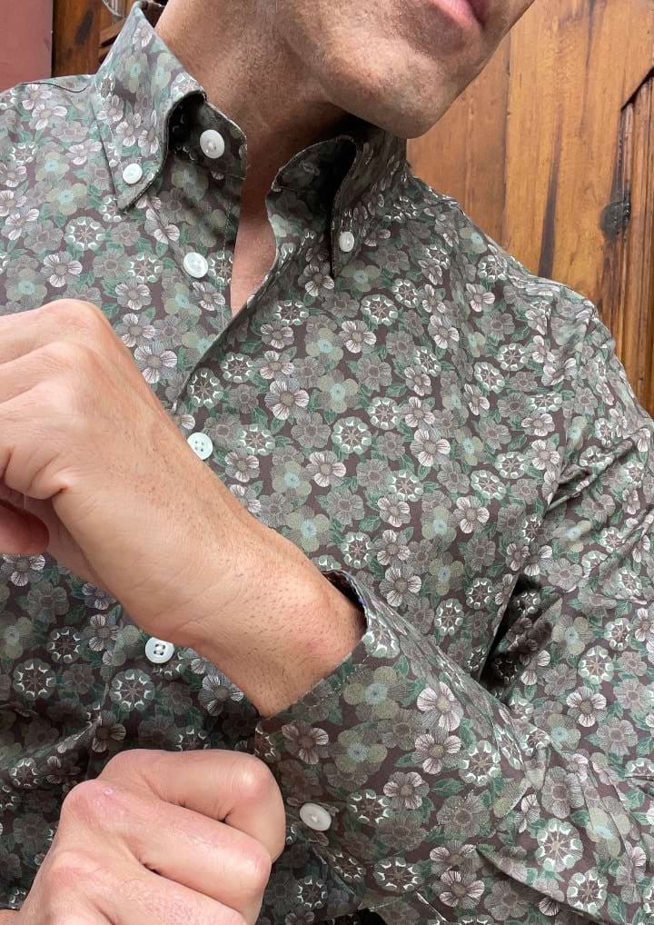 – Estampado floral sobre fondo marrón.