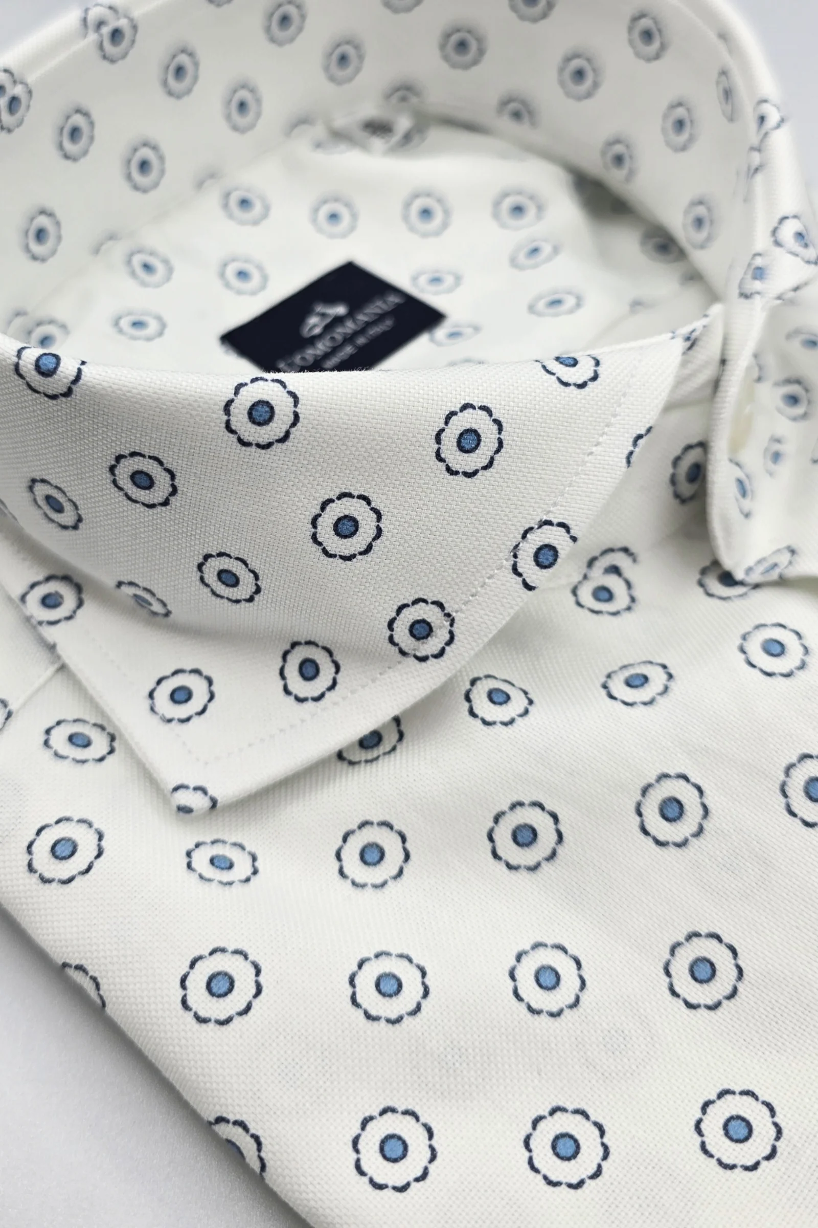Camisa Forte dei Marmi en tejido Oxford 100% algodón. Diseño de patrón de flores azules, sobre fondo blanco.