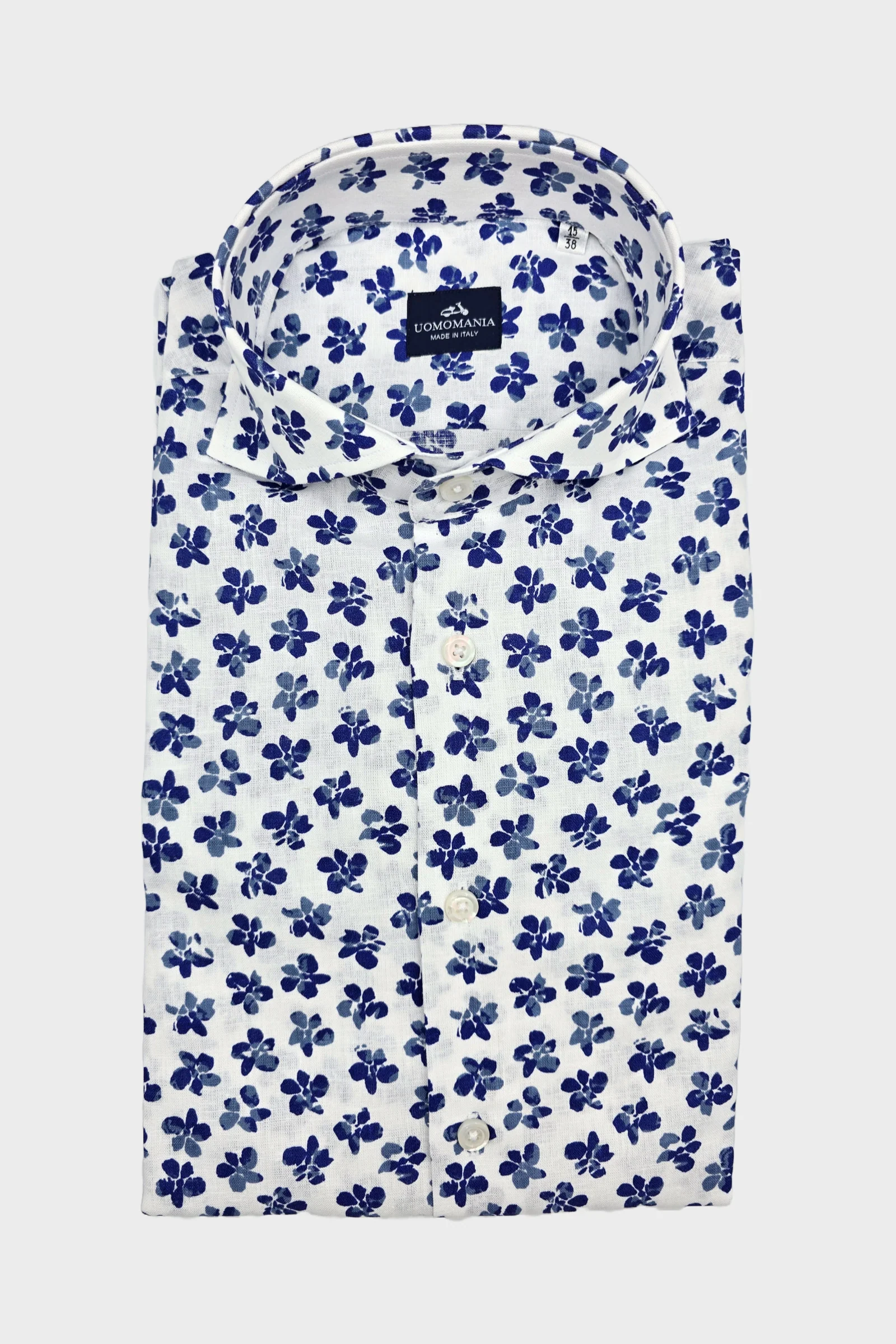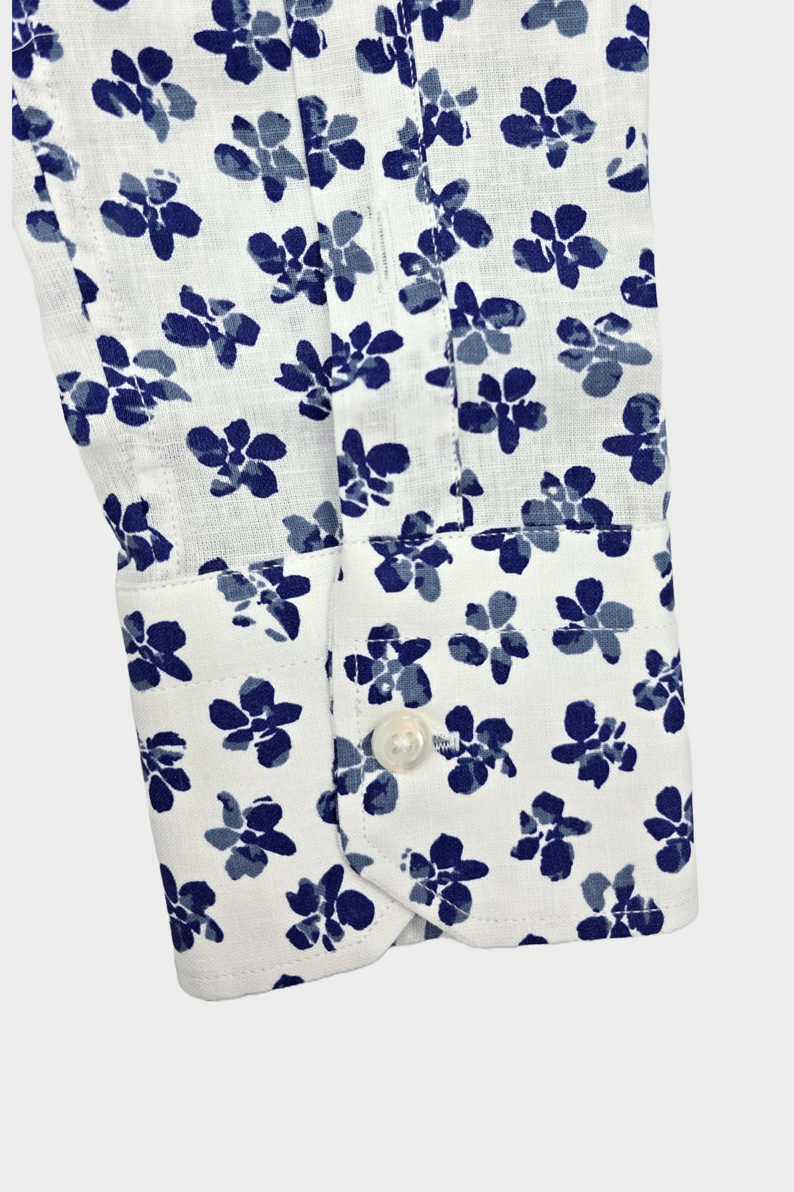 Camisa Pacha en 100% Puro Lino con estampado de elegantes flores, en tonalidades de azul Denim intenso, sobre fondo blanco.