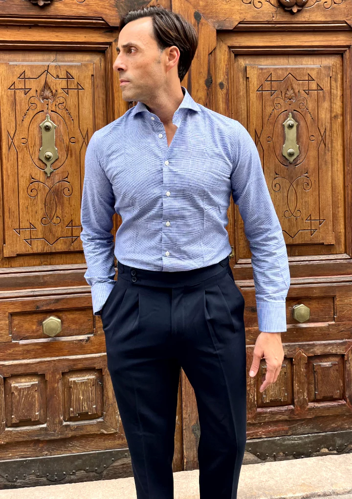 Una Camisa de hombre original y elegante, con elegante contraste de dibujo geométrico en azul marino.