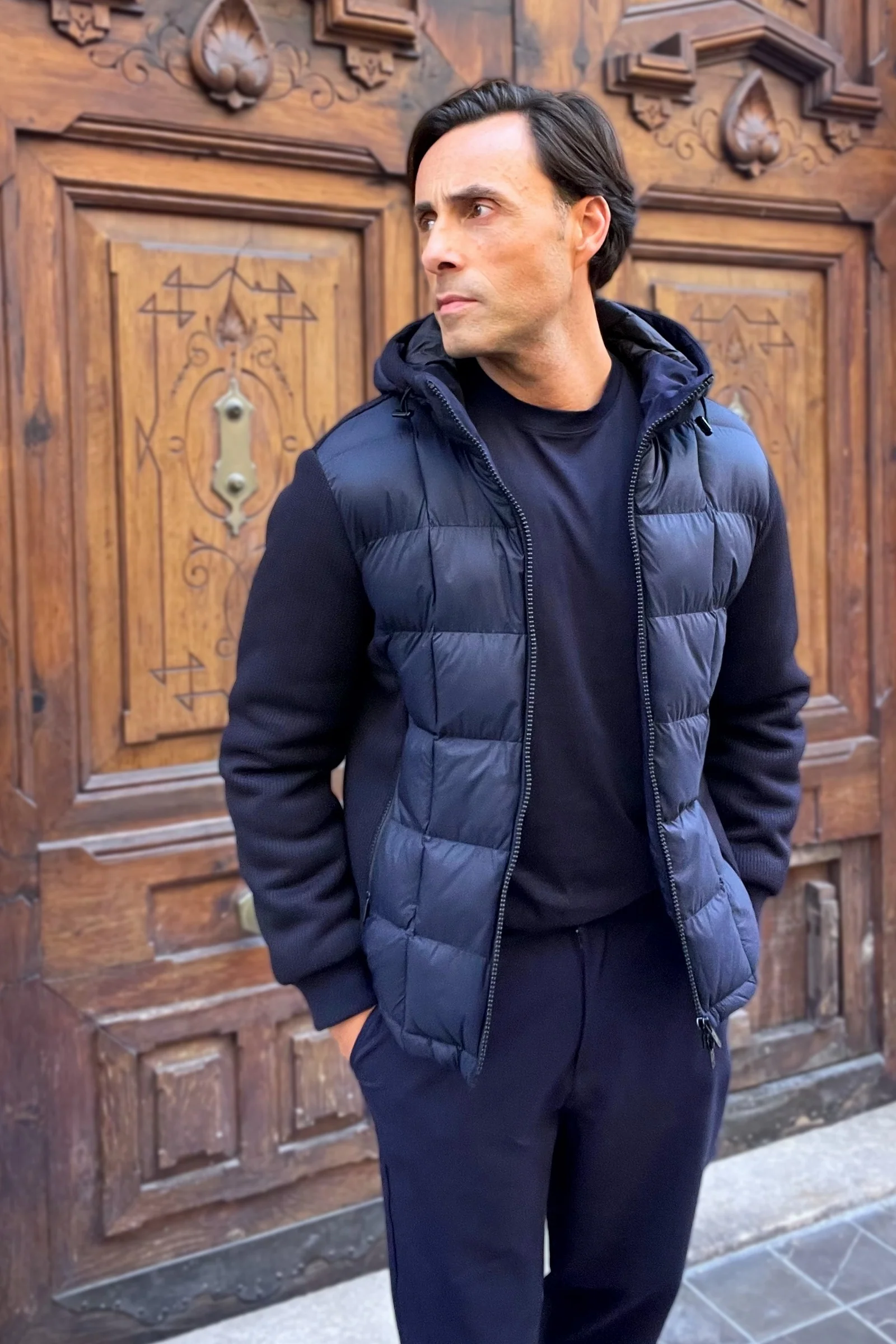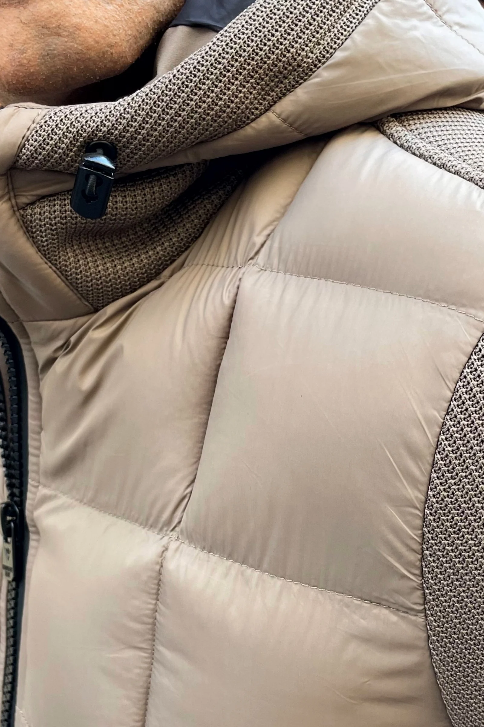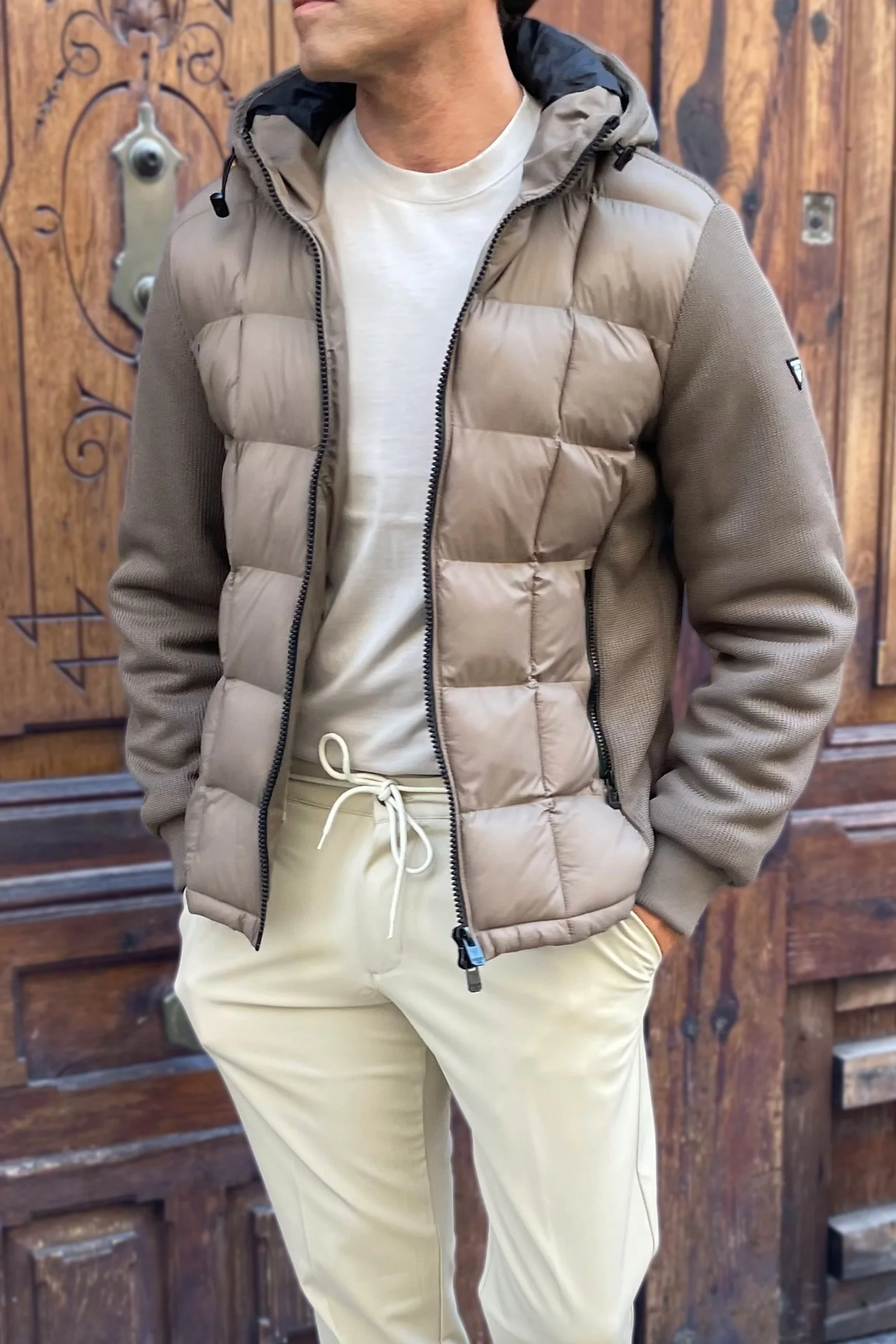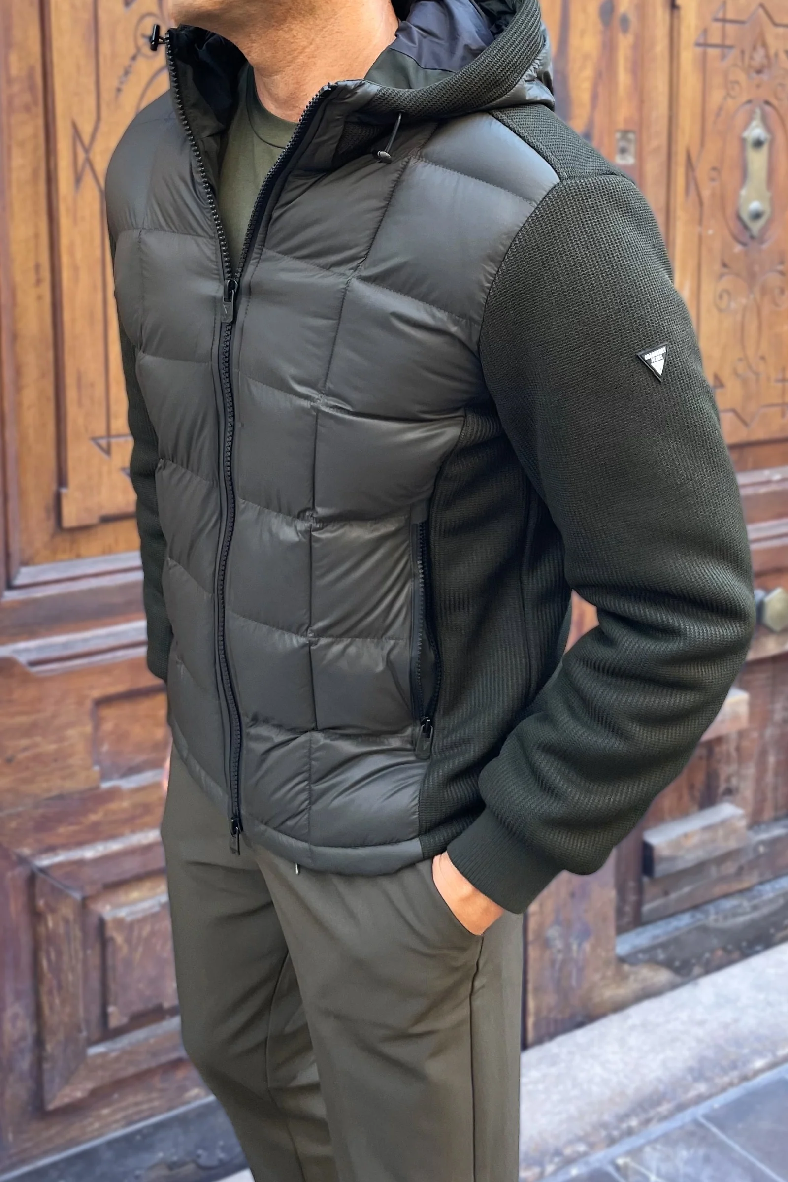 La Cazadora Gianluca lo consigue con una construcción híbrida: cuerpo acolchado en tejido técnico ultraligero y mangas de punto elástico que aportan libertad de movimiento y una silueta limpia.