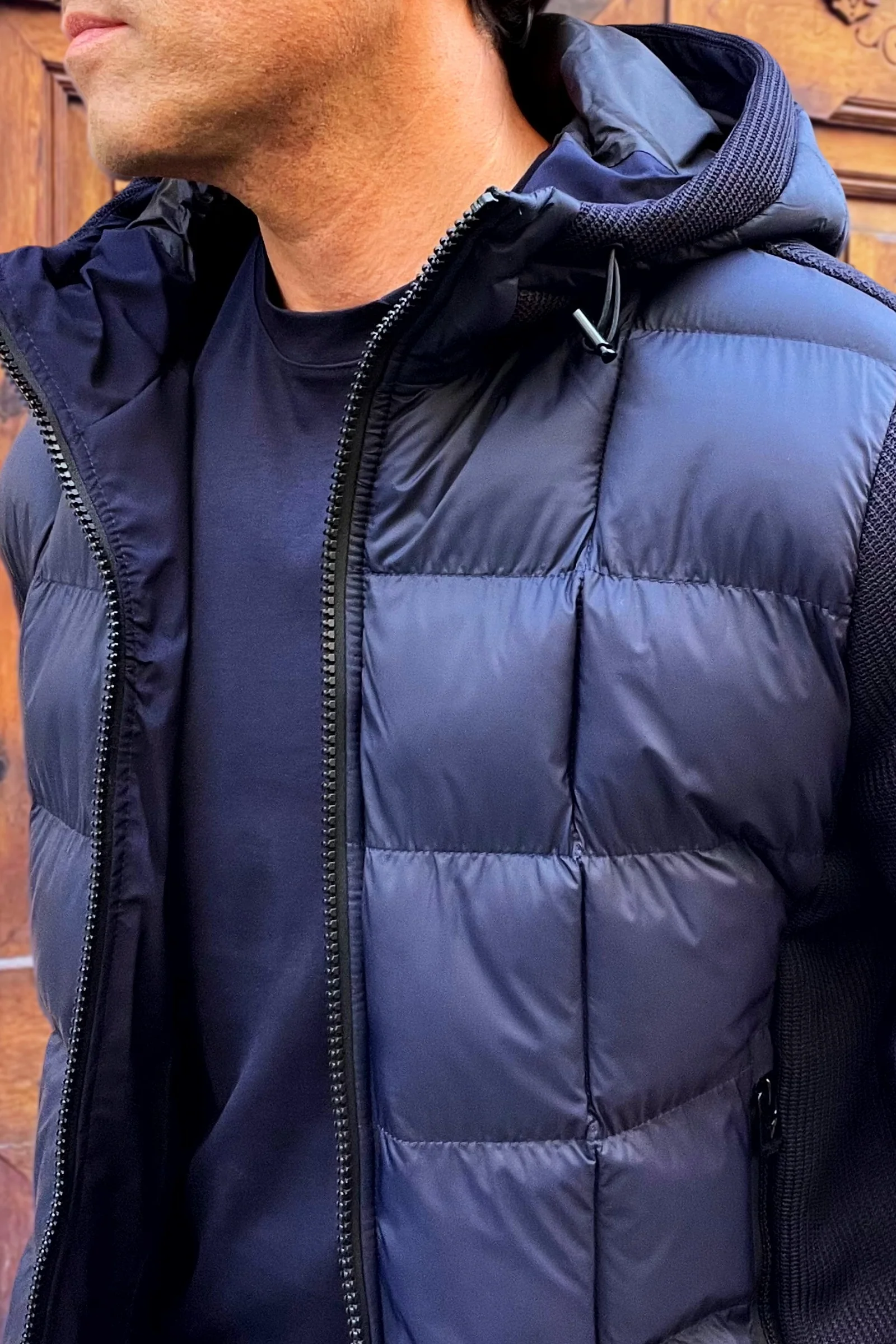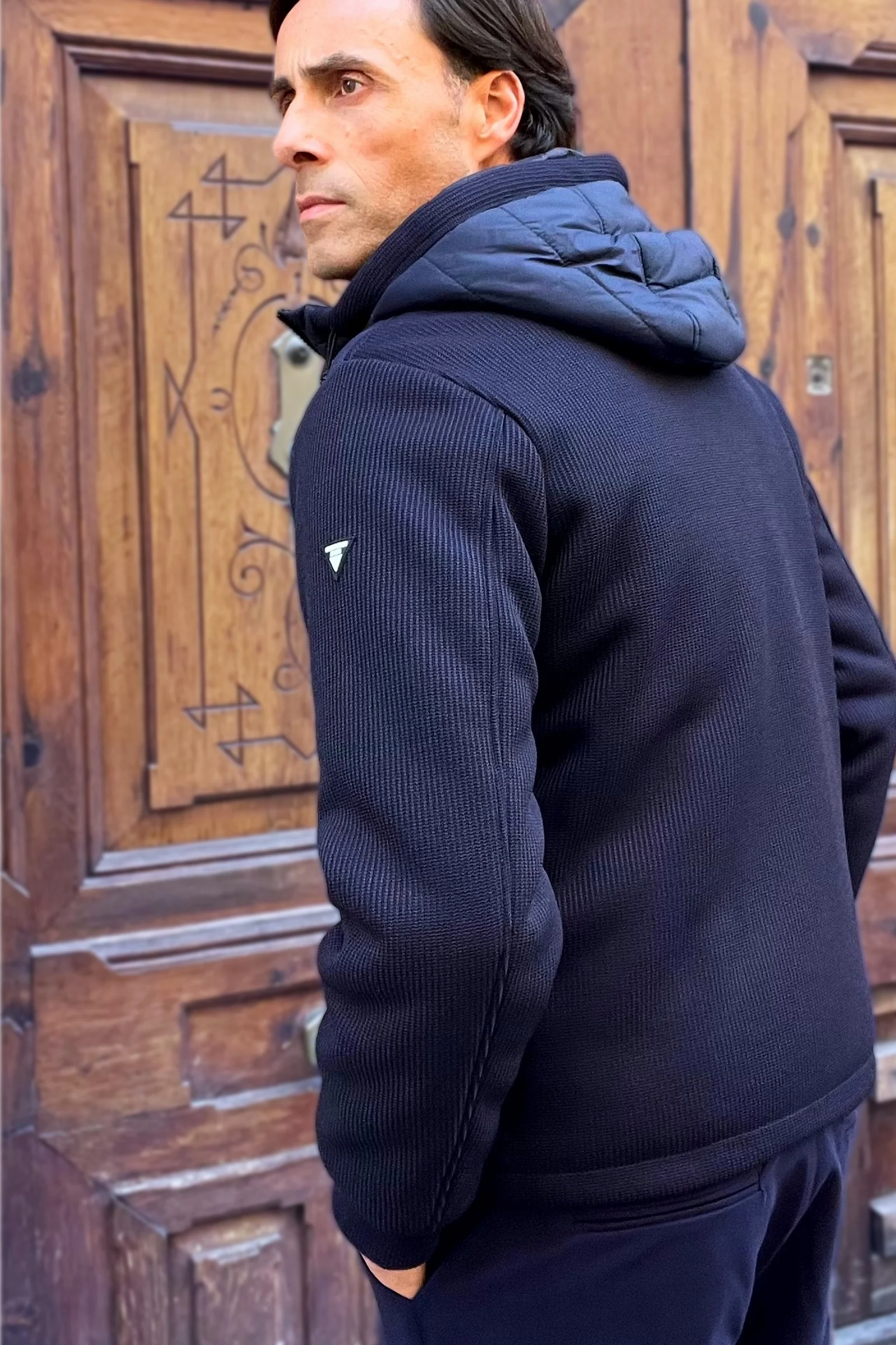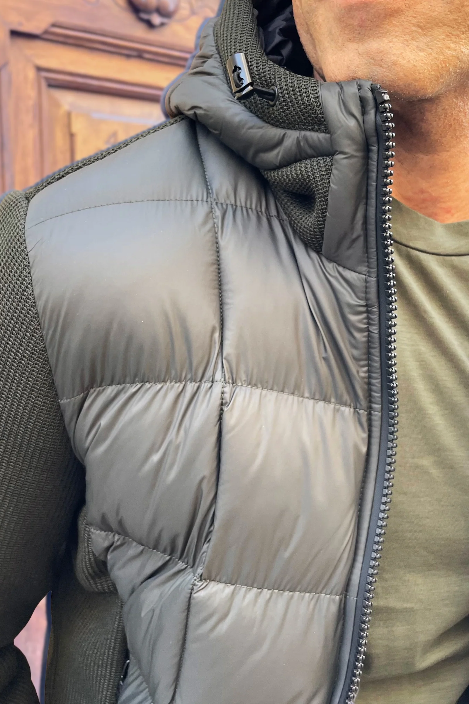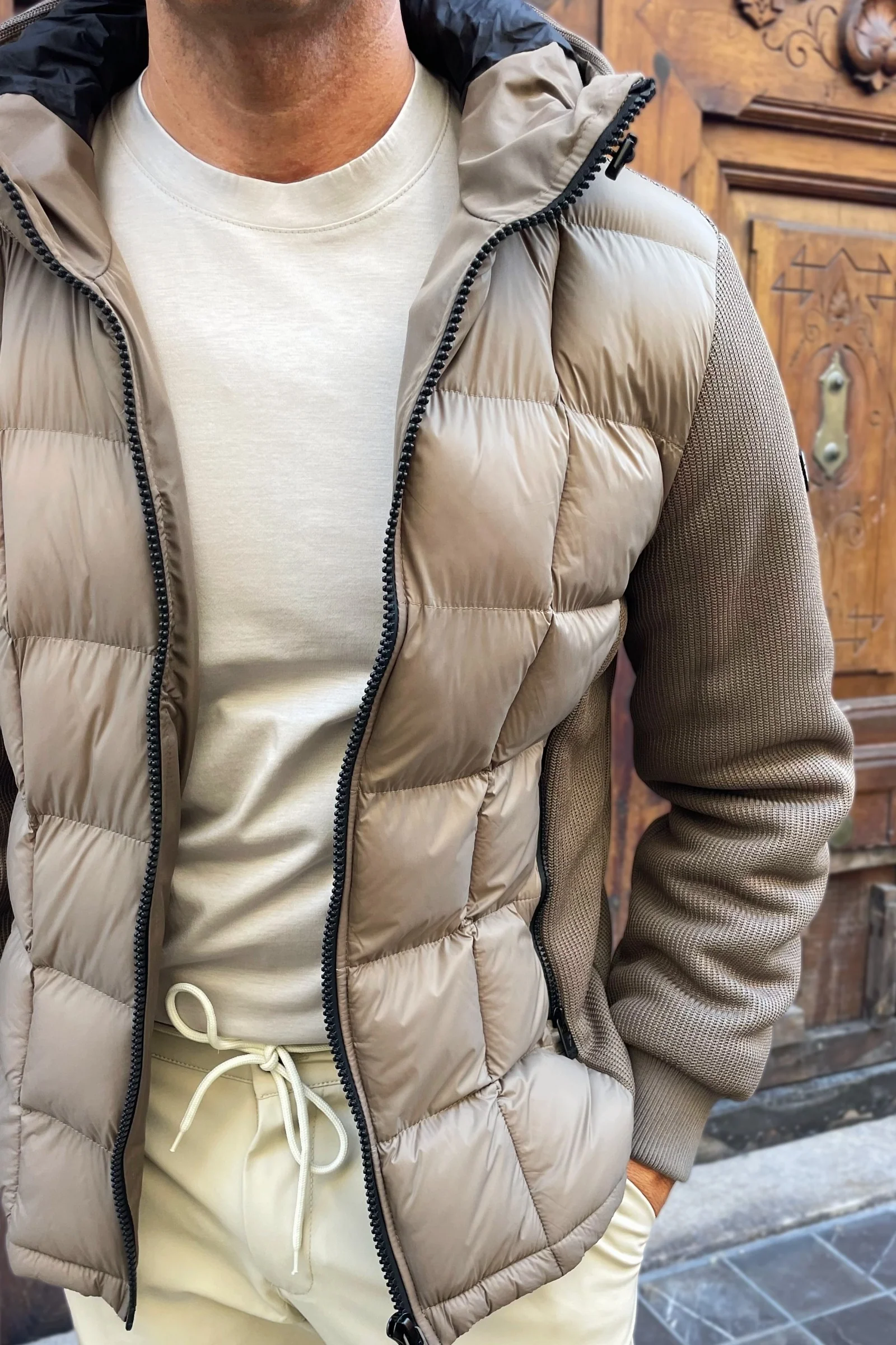 La Cazadora Gianluca lo consigue con una construcción híbrida: cuerpo acolchado en tejido técnico ultraligero y mangas de punto elástico que aportan libertad de movimiento y una silueta limpia.