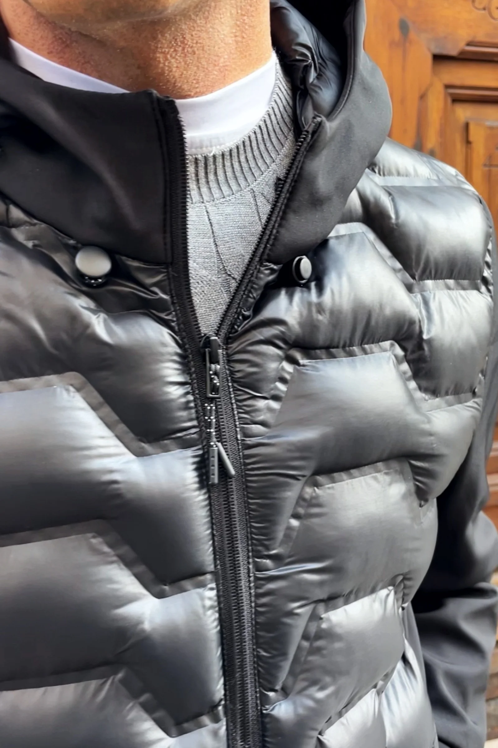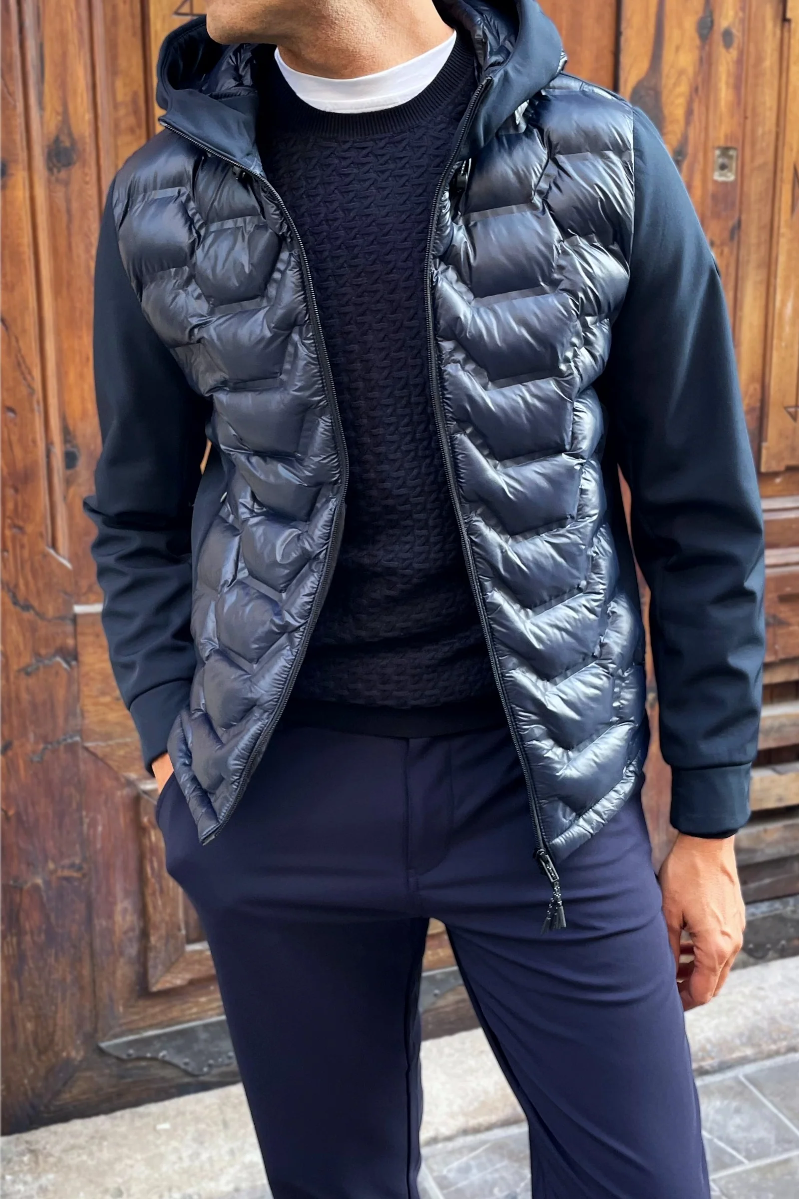 Chaqueta con frontal y capucha acolchados combinada con tejido punto roma.