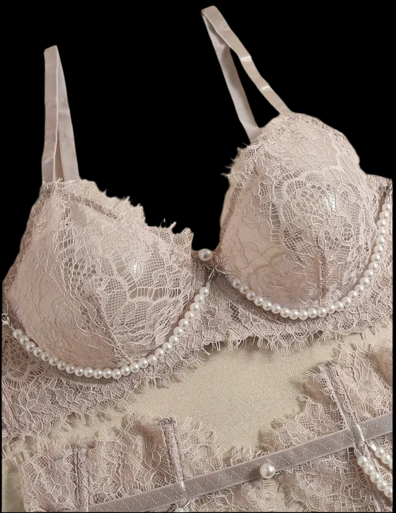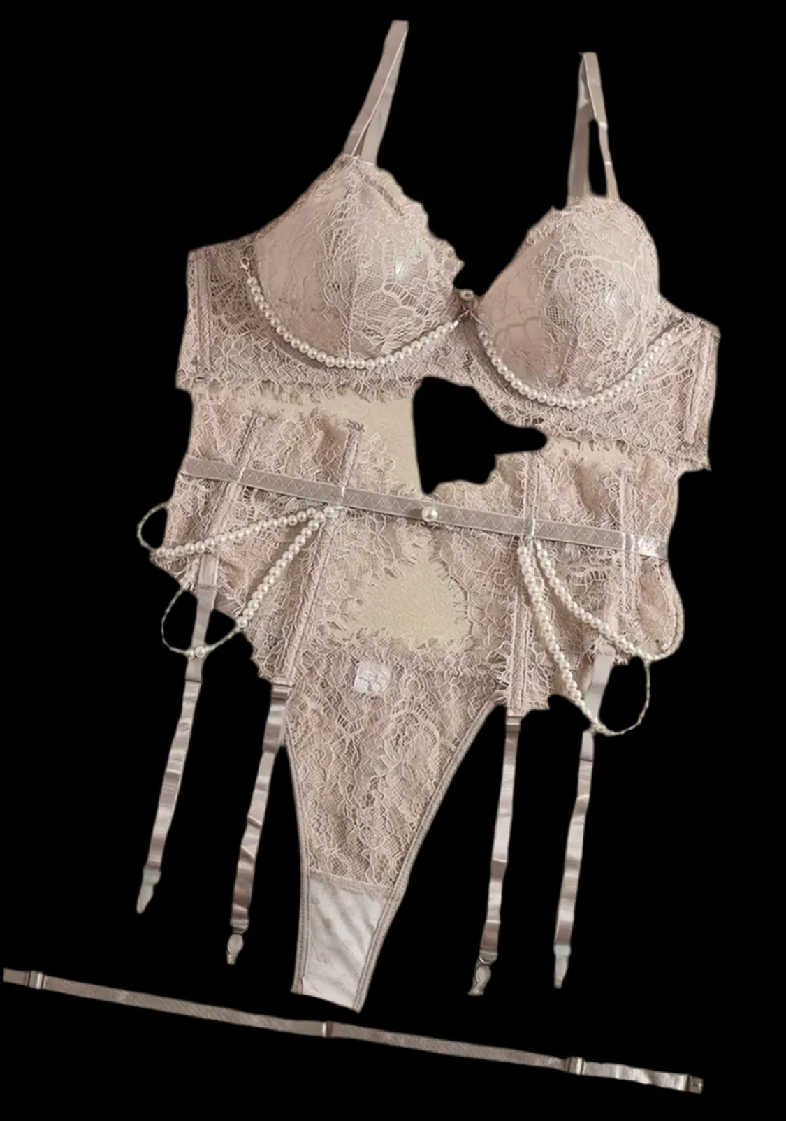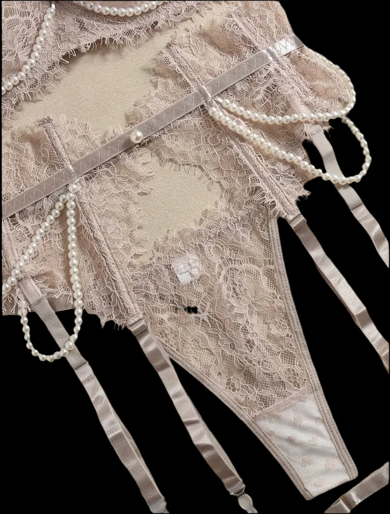 Incluye: sujetador con aros y copas de encaje, tanga a juego, liguero con volantes de encaje delicado y cadenas de perlas decorativas a ambos lados, más tiras ajustables para las piernas. En total, 5 piezas.