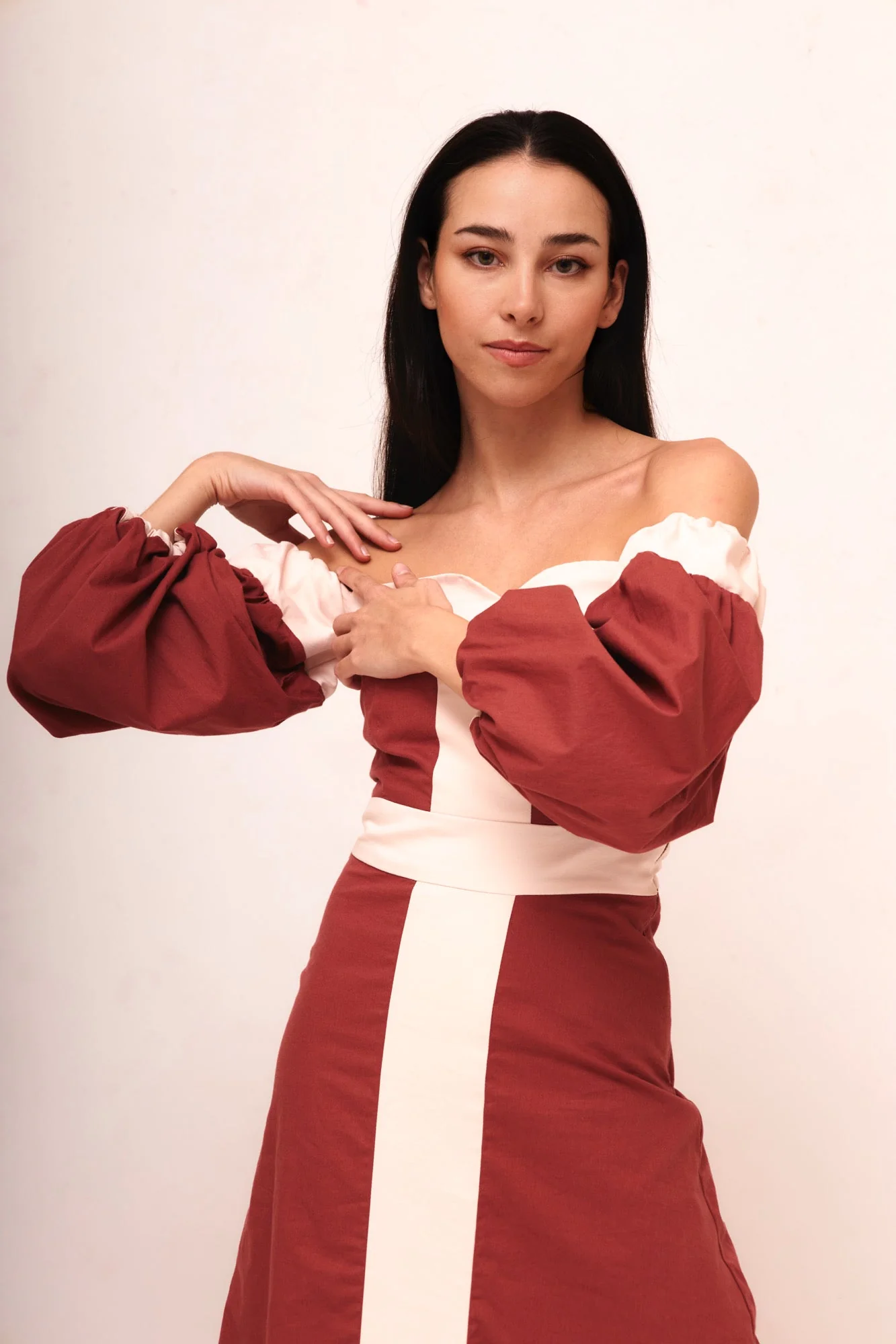 Vestido midi color rosa teja de palabra de honor con mangas abullonadas ajustadas en el antebrazo.