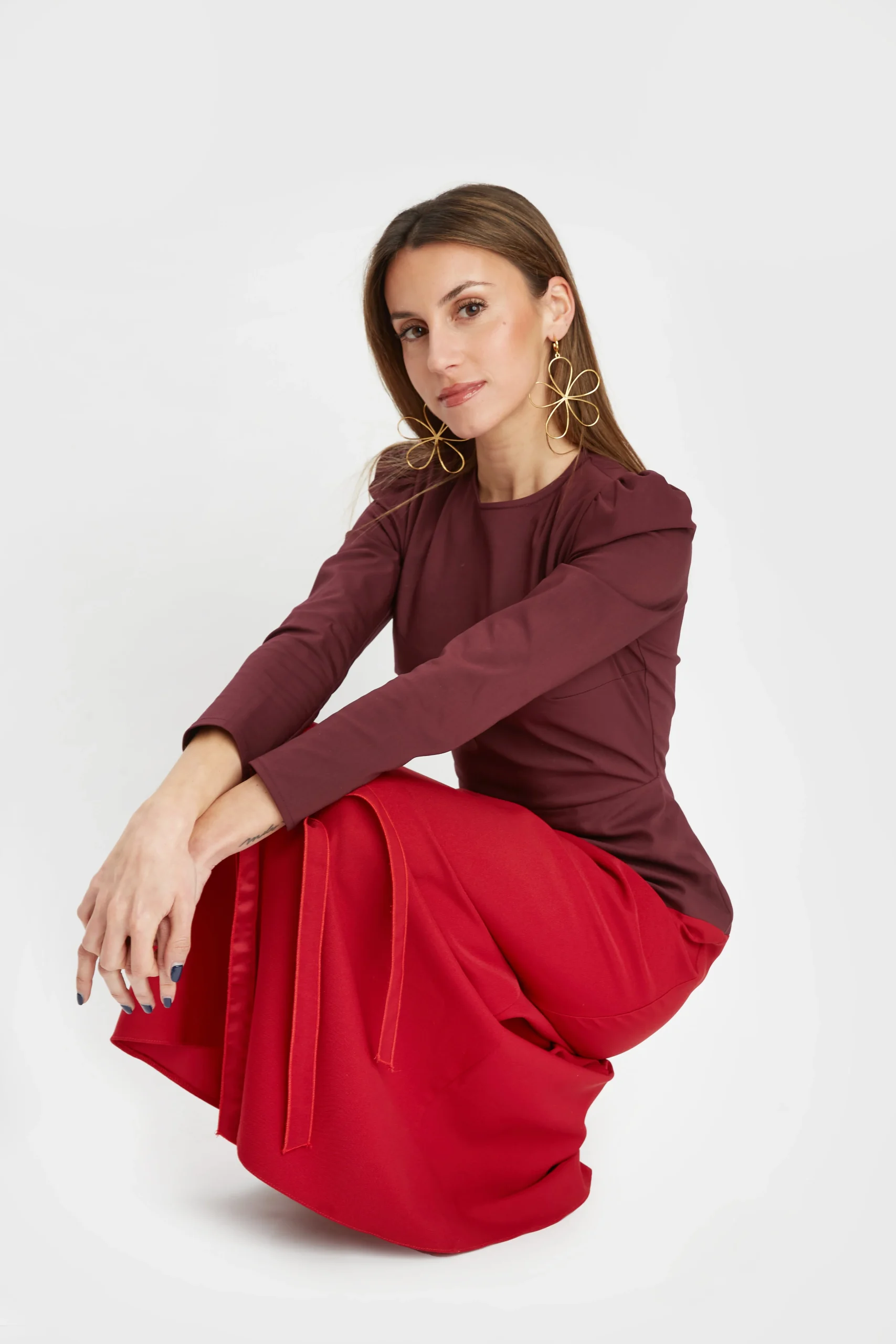 Vestido midi bicolor granate y rojo con hombreras. Cierre cremallera lateral.
