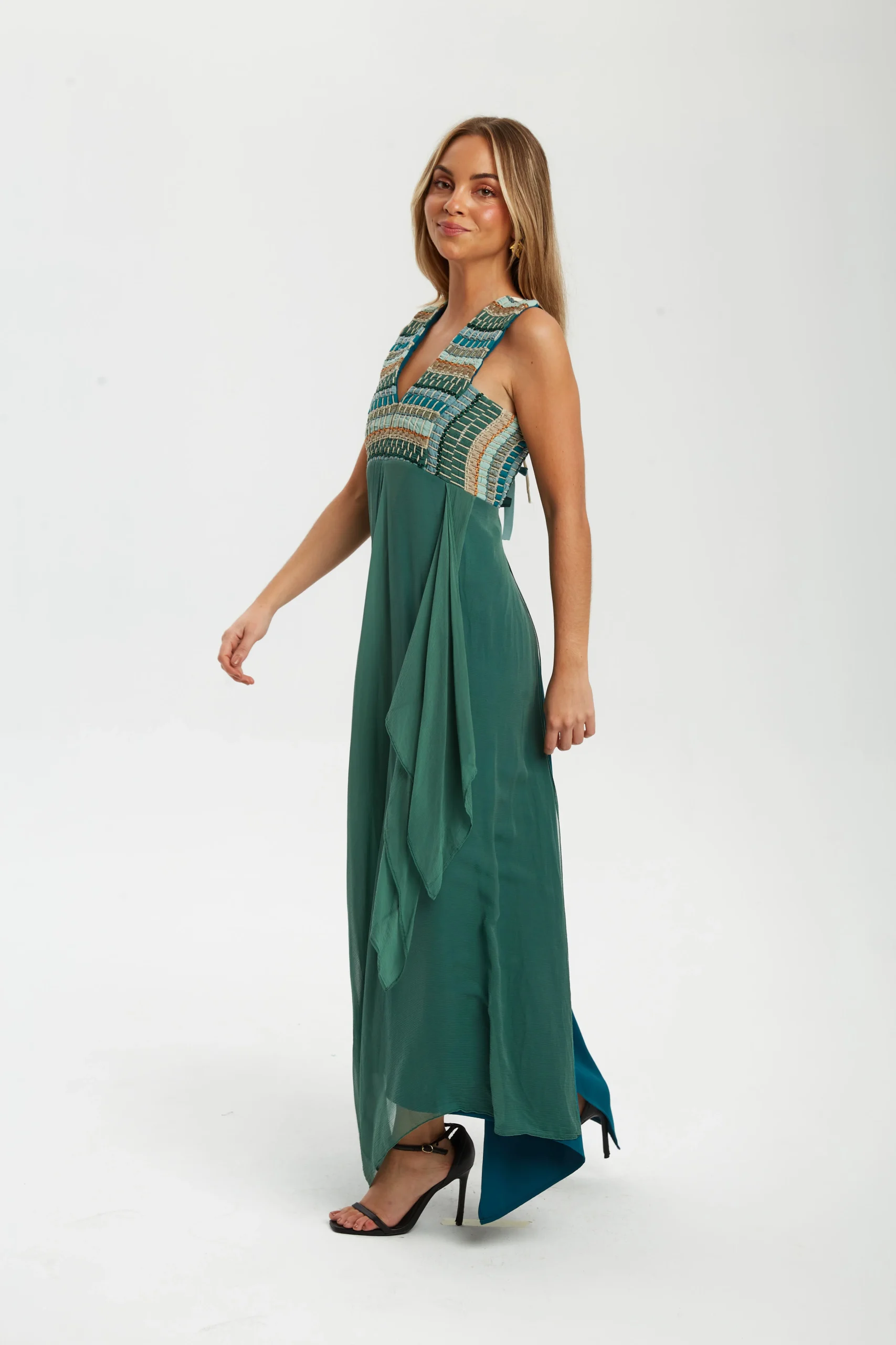 Vestido midi verde con cuerpo estampado sin mangas y espalda atada con lazadas. Bámbula de seda 100%