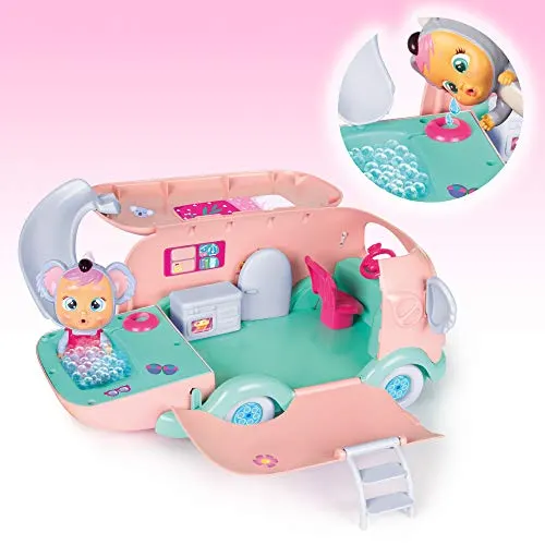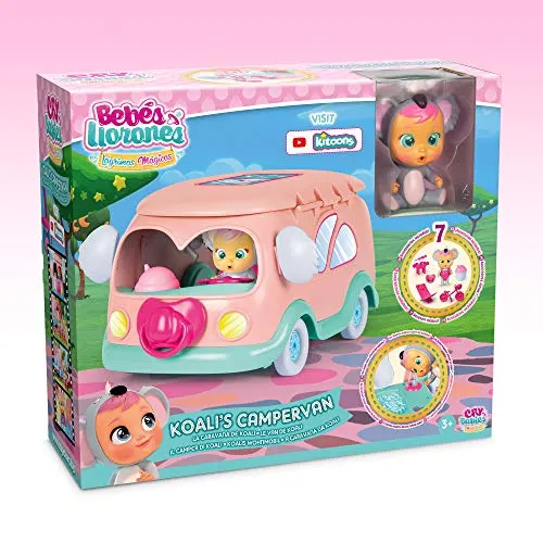 La Autocaravana de Koali Bebés Llorones incluye una mini muñeca Bebé Llorón llamada Koali. Esta muñeca es articulada y está vestida con un pijama inspirado en un koala. Cuando le das agua con su biberón mágico y aprietas su barriguita, Koali llora lágrimas de verdad. Además, al dejar caer lágrimas en el depósito de lágrimas, el jacuzzi se activa y hace burbujitas mágicas. Los niños pueden organizar una barbacoa, llevar la caravana en bici o hacerla bajar por el tobogán hasta el jacuzzi. ¡Las posibilidades son infinitas!