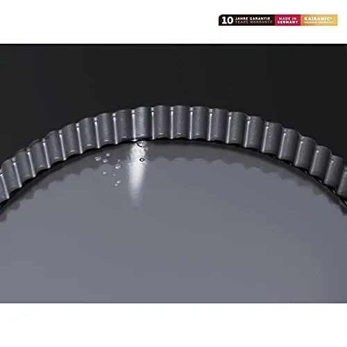 La Base para Tartas Kaiser La Forme Plus cuenta con un recubrimiento antiadherente de cerámica KAIRAMIC que garantiza que tus tartas no se peguen al fondo al desmoldarlas, y que sea fácil de limpiar después de su uso. Además, su base es resistente a los cortes, lo que te permitirá preparar y cortar tus tartas directamente en ella sin dañarla.