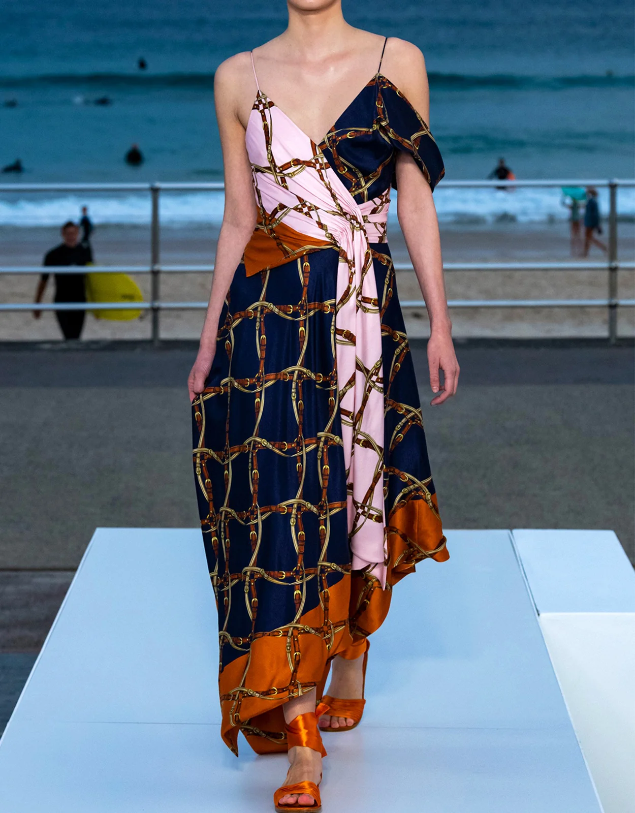 Vestido asimétrico con estampado de cadenas en tonos rosa, azul y terracota. Tiene tirante fino, drapeado en la cintura y falda de largo irregular con caída ligera.