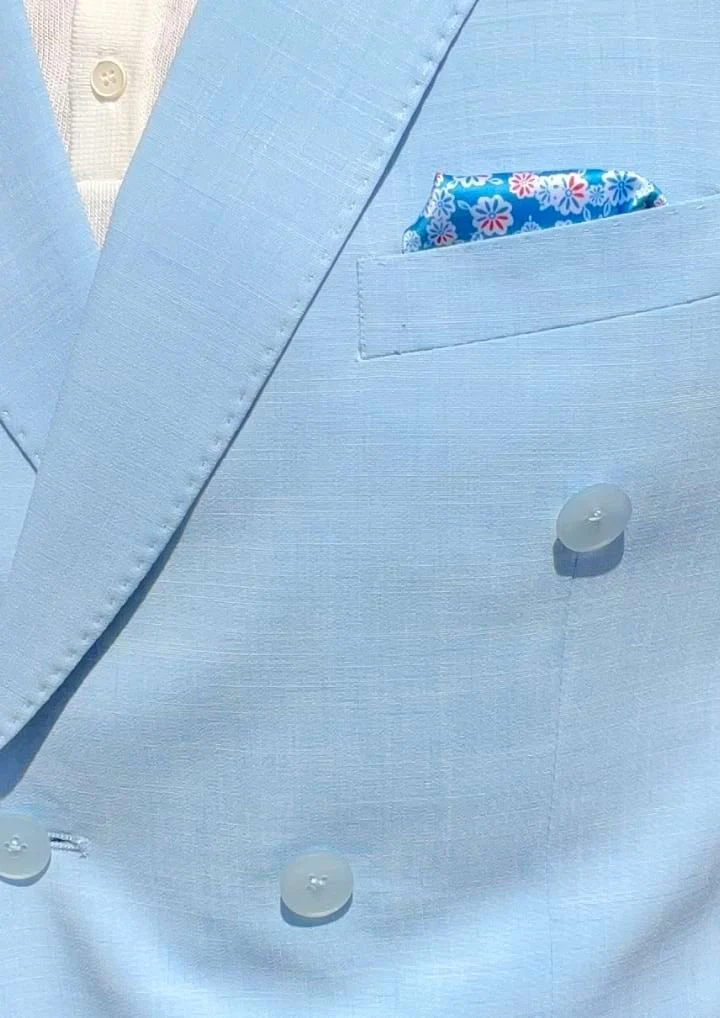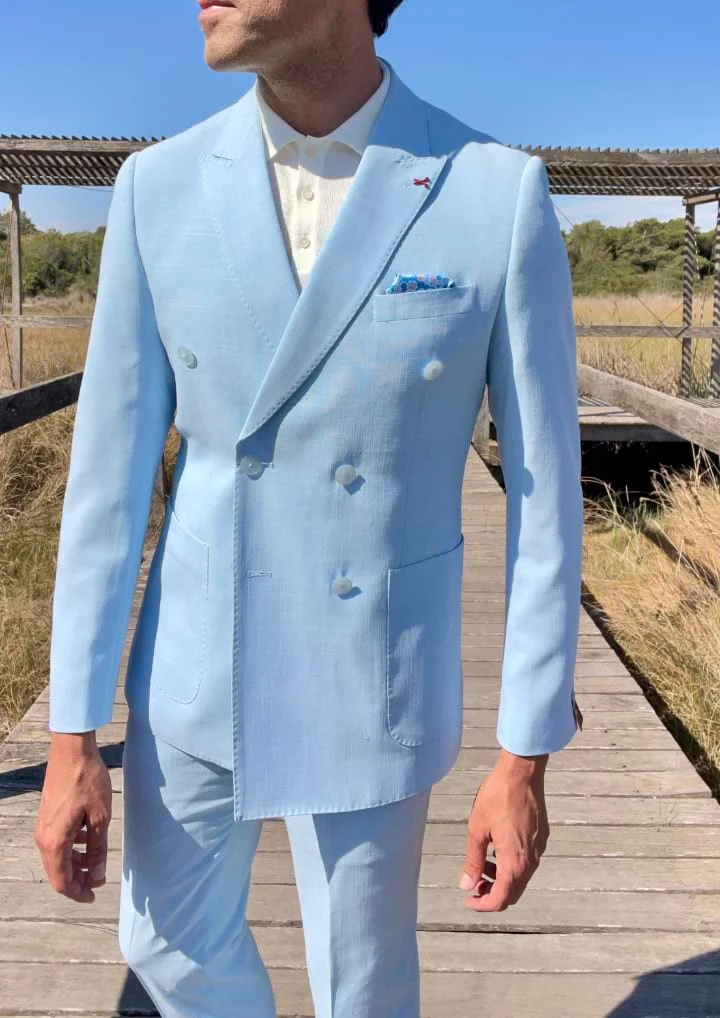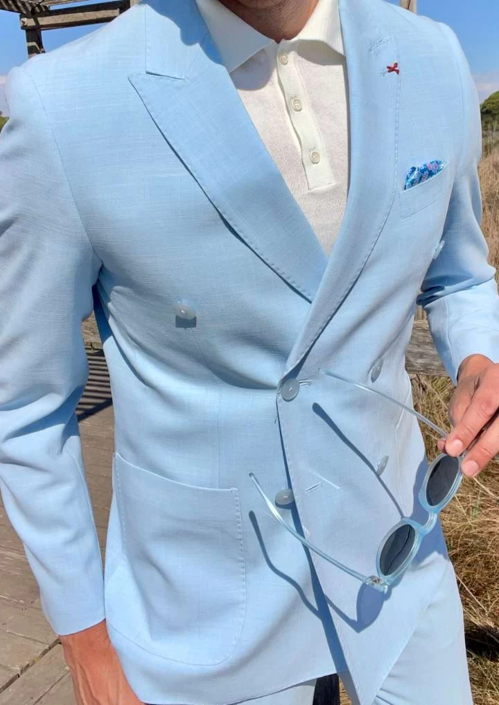 Rompe moldes y abraza la elegancia con este traje cruzado atevido y chic, en color azul claro. Solo apto para hombres que no desean pasar inadvertidos.
