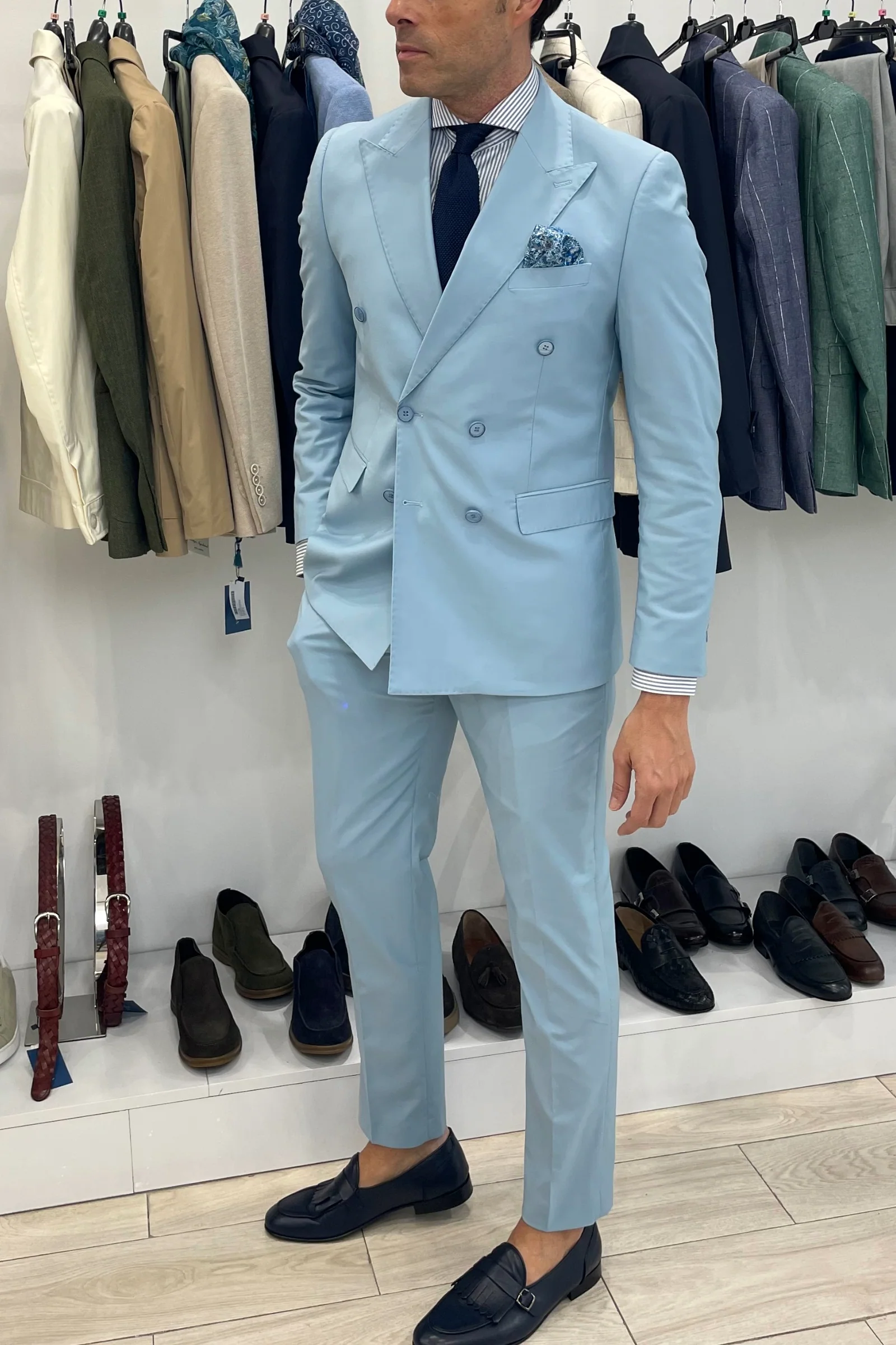 Botones cruzados, espectacular color celeste y el impecable italian fit que nos distingue.