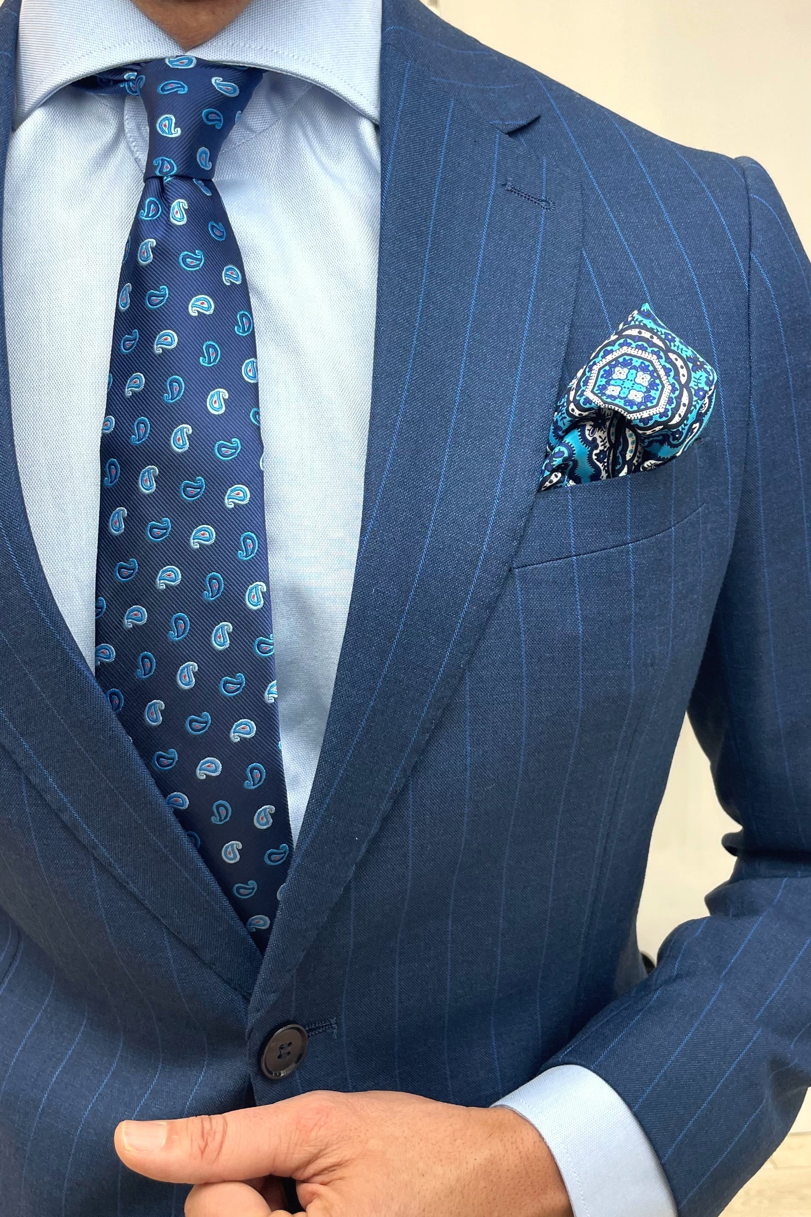 Traje dos botones en tejido de raya diplomática, sobre fondo azul medio.