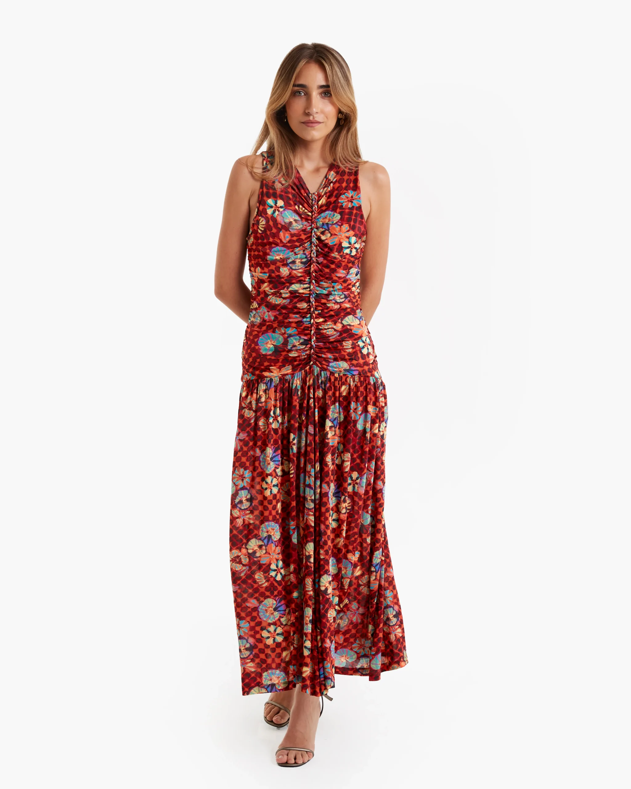 Vestido maxi en un tono rojizo anaranjado con estampado floral. Tela elástica con fruncido que se ajusta al cuerpo. Falda de tiro bajo.