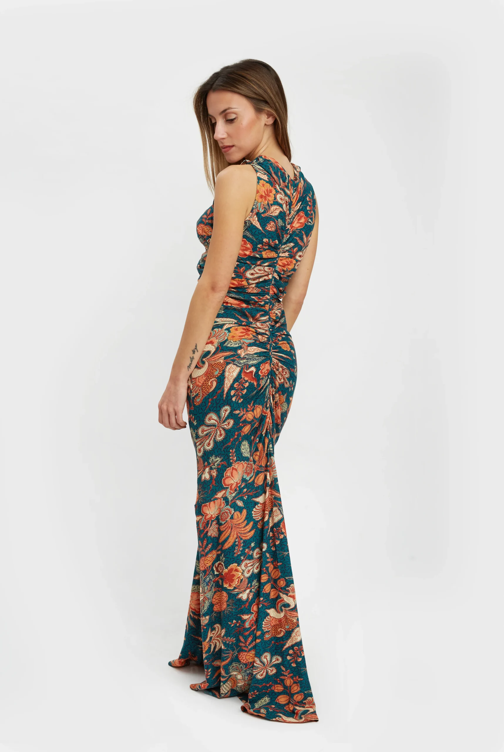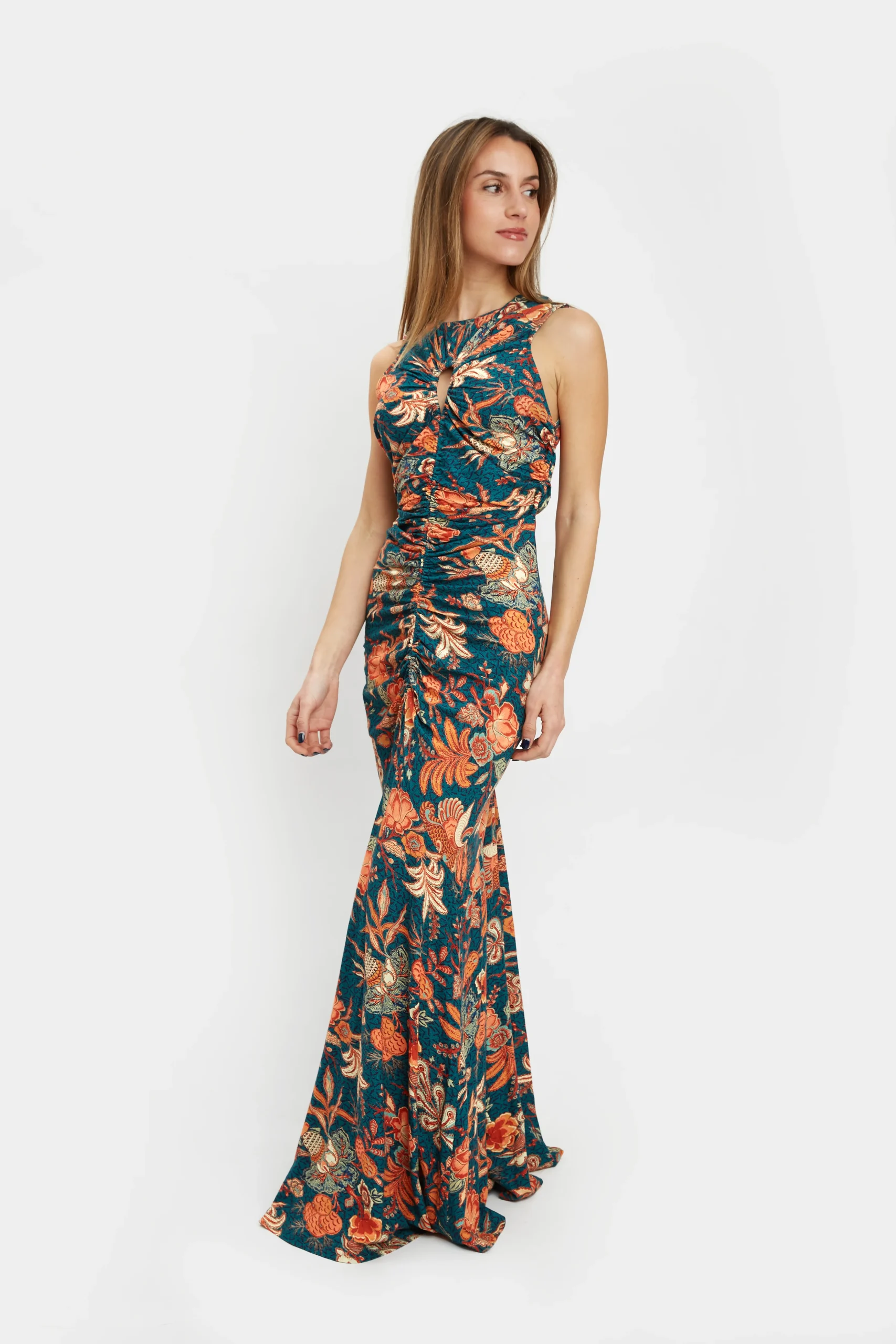 Vestido midi estampado floral en tonos turquesa y naranja, fruncido y con pequeña apertura en el pecho.